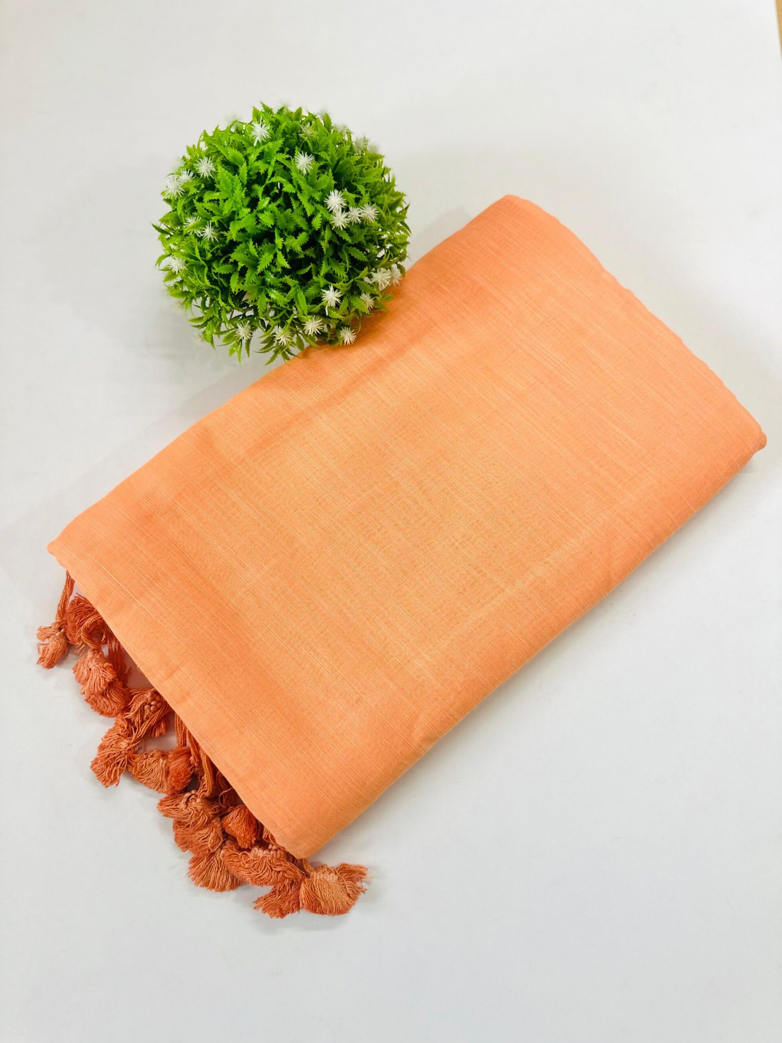 The saree featuring a textured or woven fabric  and the pallu is decorated with matching tassels. It presents a simple, elegant, and traditional look.