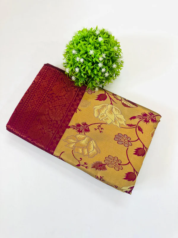 Color & Pattern:The saree features a Mustard Yellow/Gold body with large Maroon/Burgundy floral motifs. It has a contrasting, densely woven Maroon/Burgundy border and pallu with gold ornamental patterns.