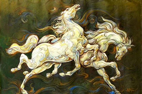 This artwork portrays two dynamic white horses in motion, painted with flowing, swirling strokes that create a sense of energy and freedom. The use of golden and pastel tones gives the horses a luminous, almost ethereal quality against the dark background