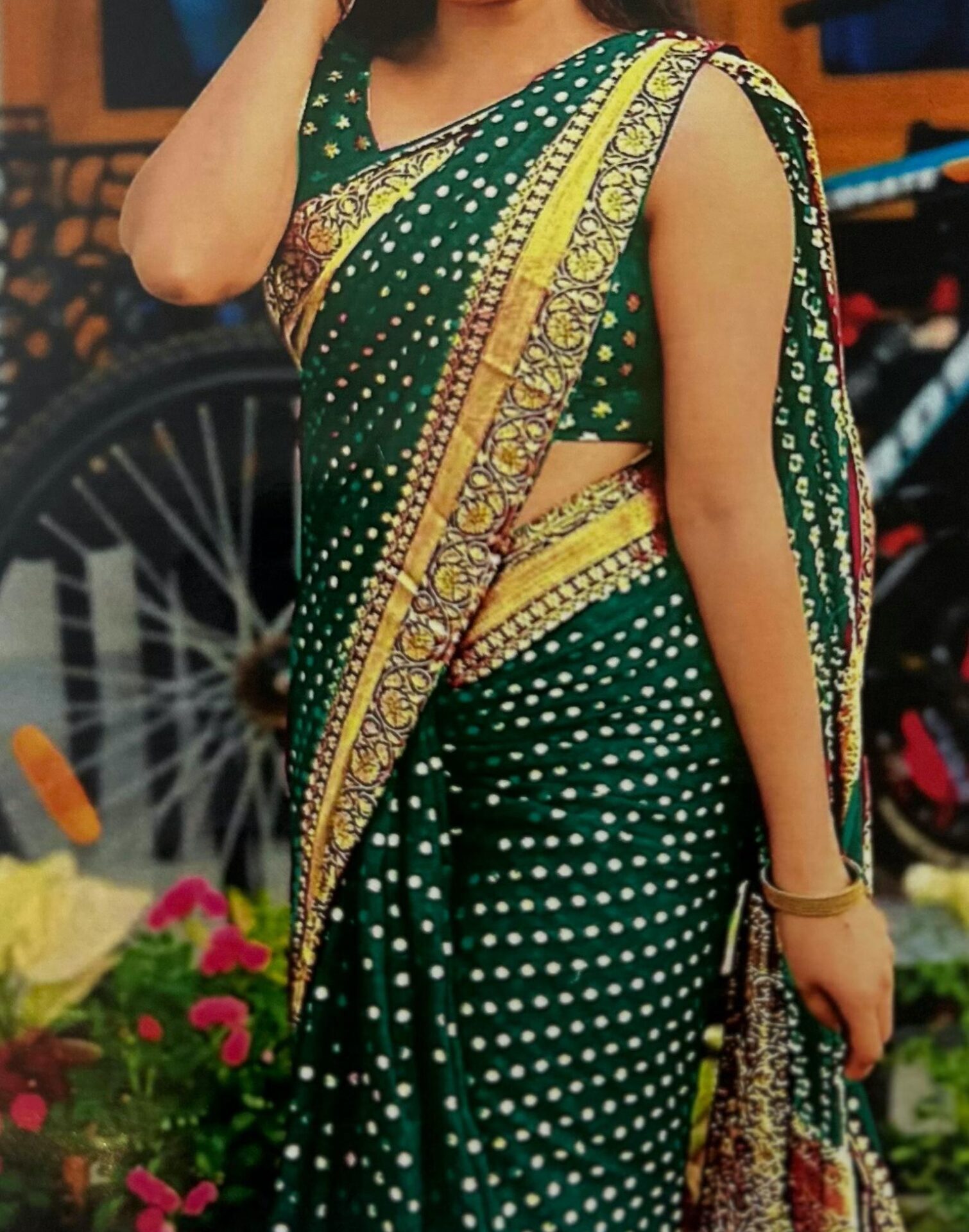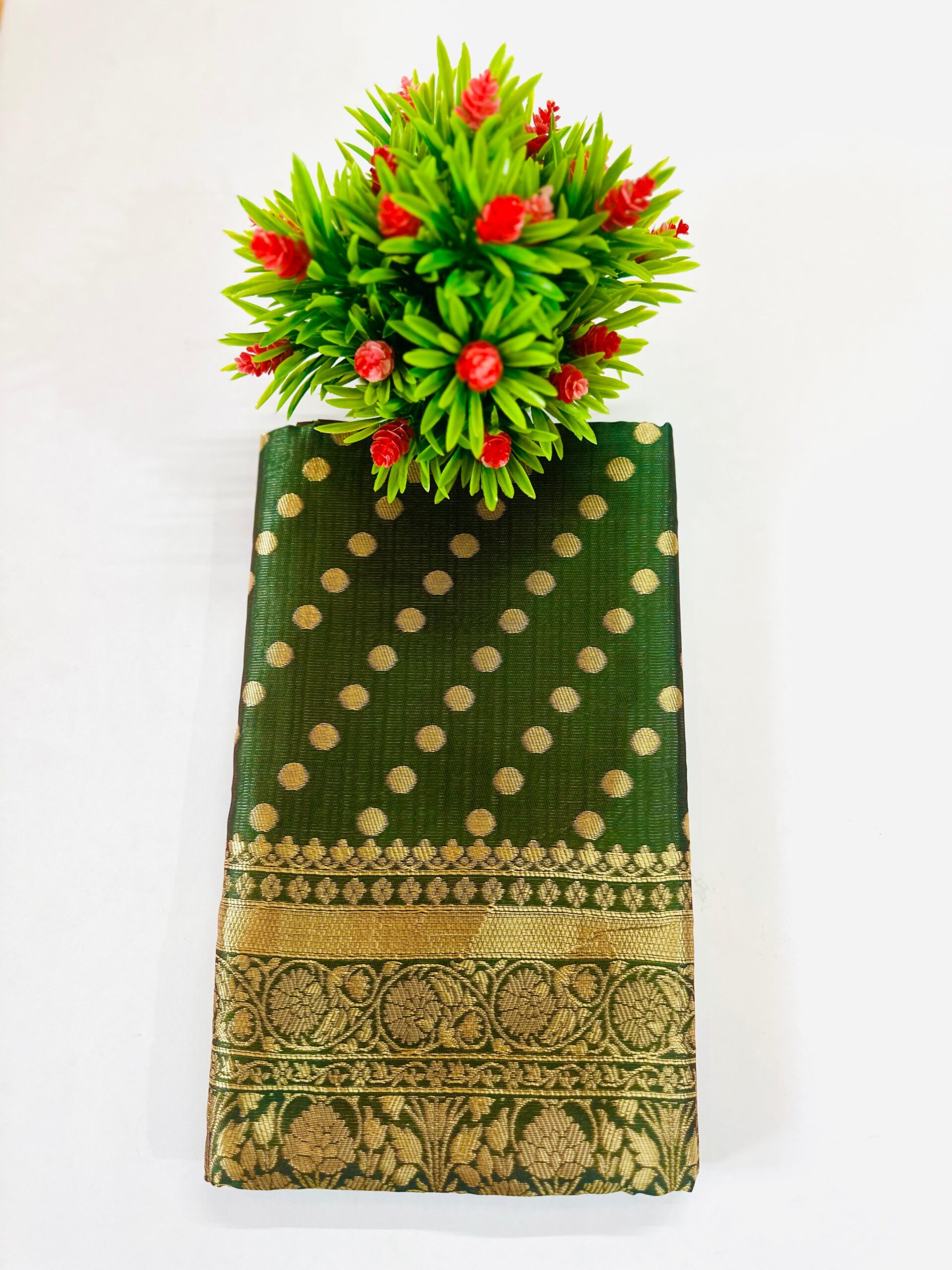 • Color & Pattern: green  Saree with gold Dot/Butti Pattern and an Ornate Gold Zari Border.