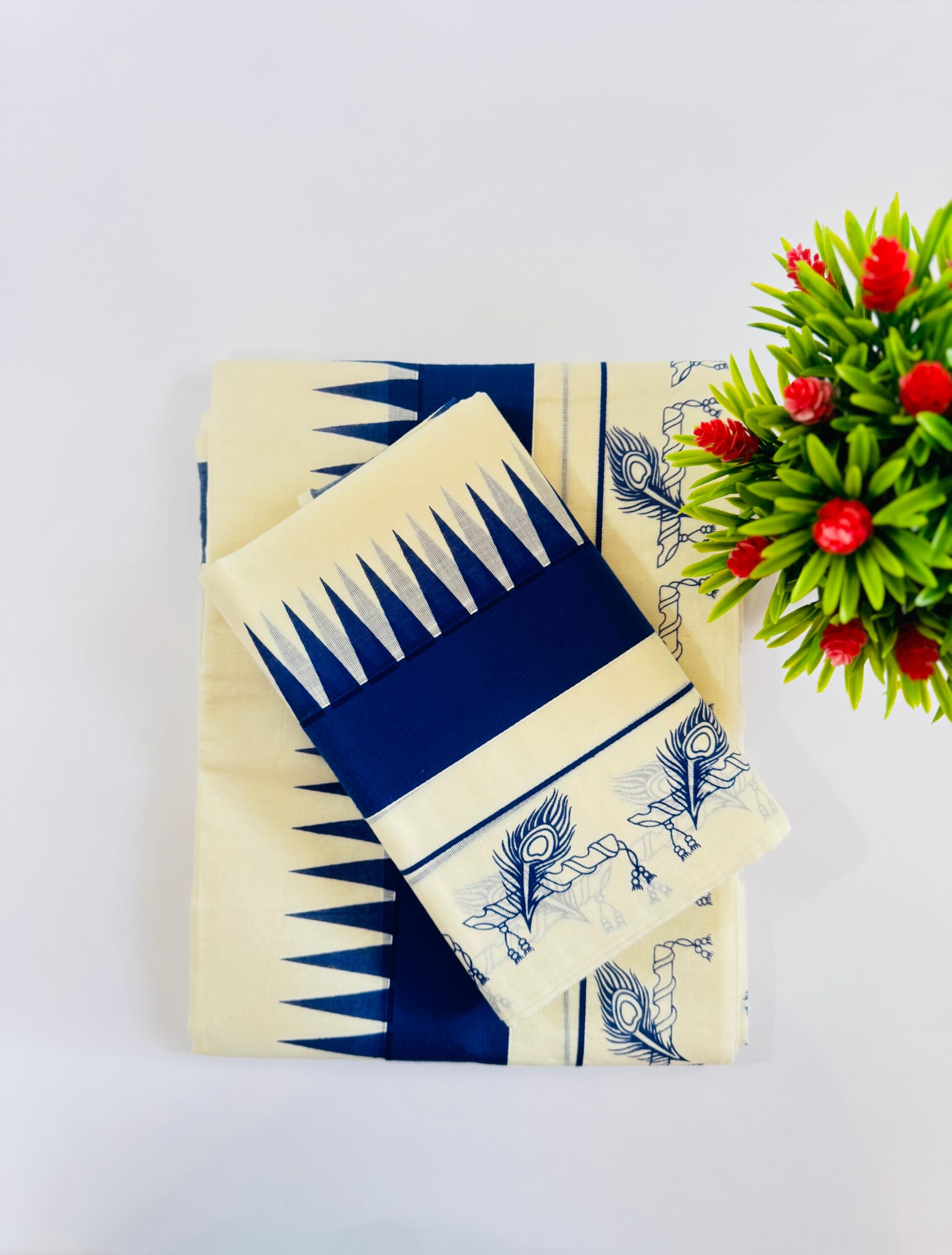 Kerala Cotton Set Mundu (Single) with Royal blue temple design border with flute and feather motifs 2.80 Mtrs