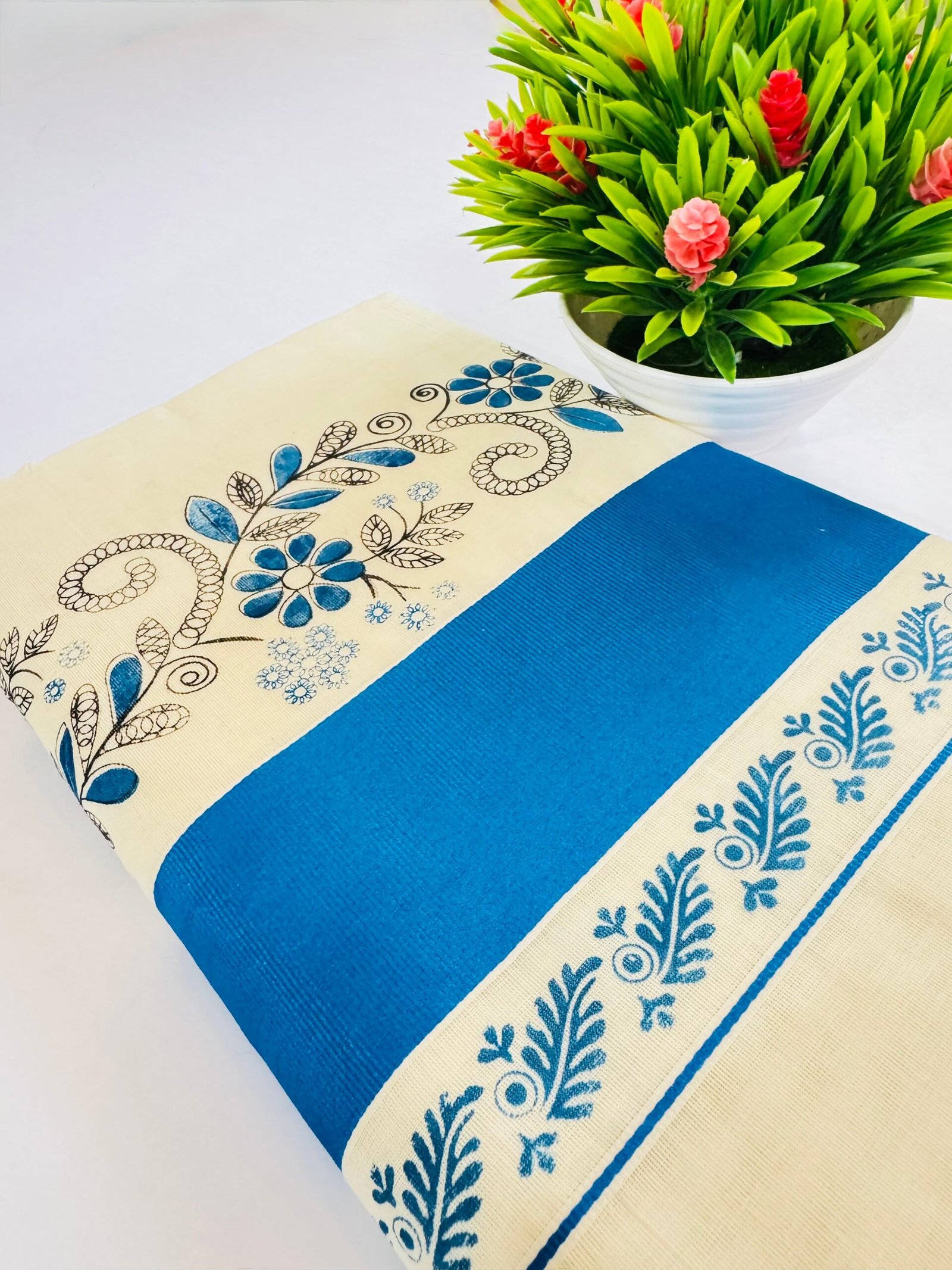 Kerala Handloom Cotton saree with blue & black floral patterns and blue border.