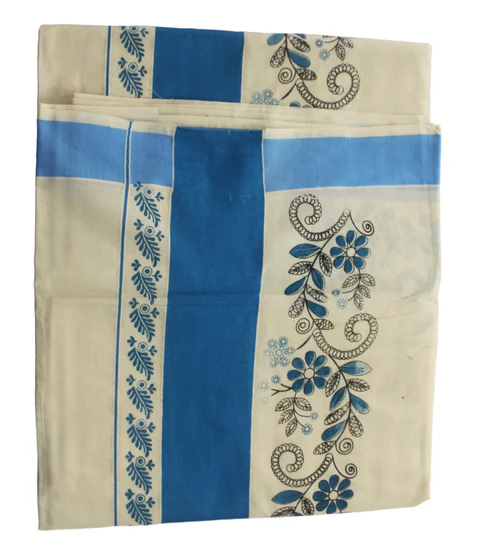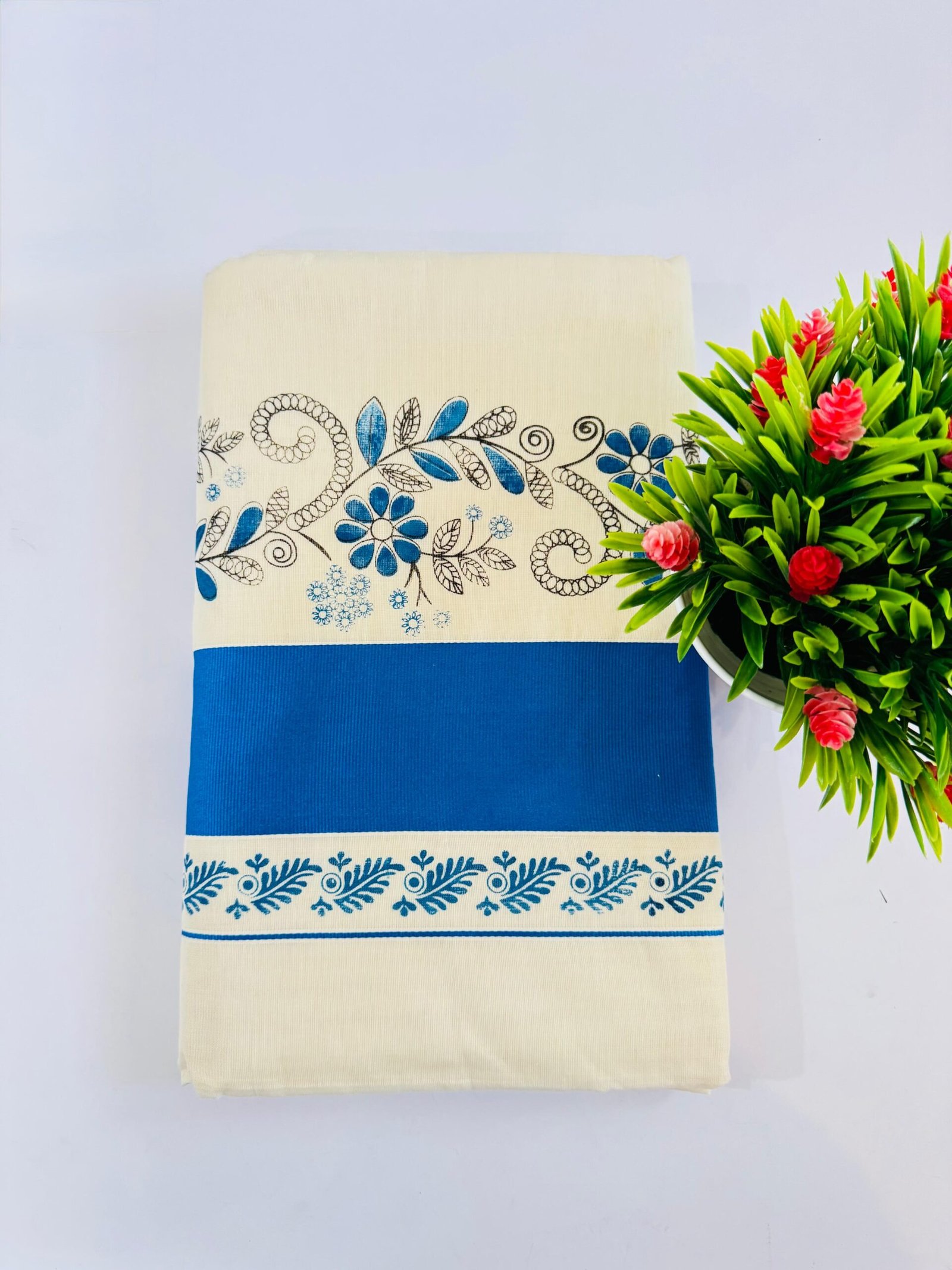 Celebrate tradition with elegance in this exquisite handloom cotton saree , designed for the discerning woman. Crafted from pure cotton, this traditional Kerala attire features a classic off-white body, accentuated by blue & black floral patterns and blue border .The Saree style is a cherished Blue border with representation of Kerala’s cultural legacy, and the set completes the look with grace and authenticity.