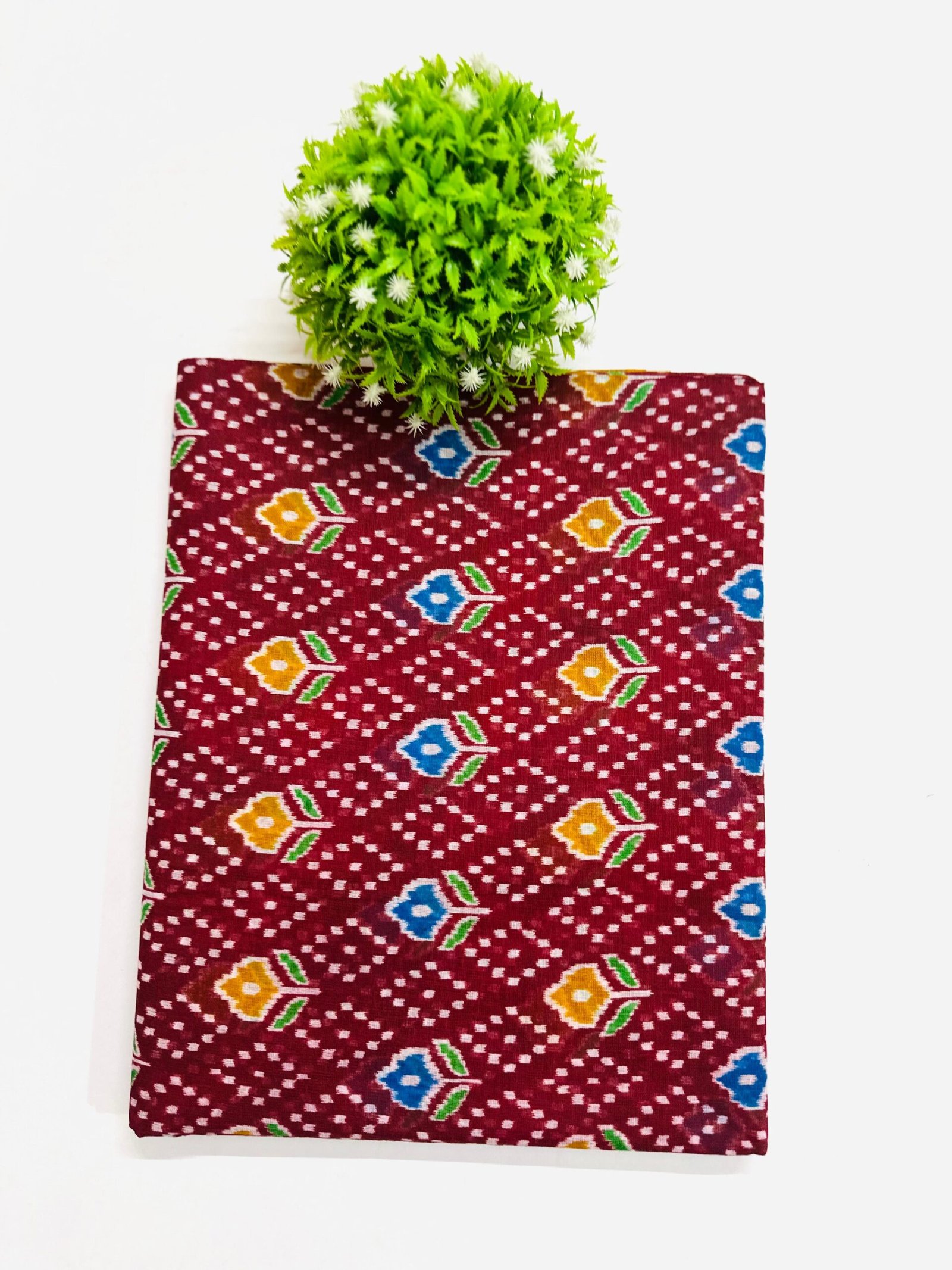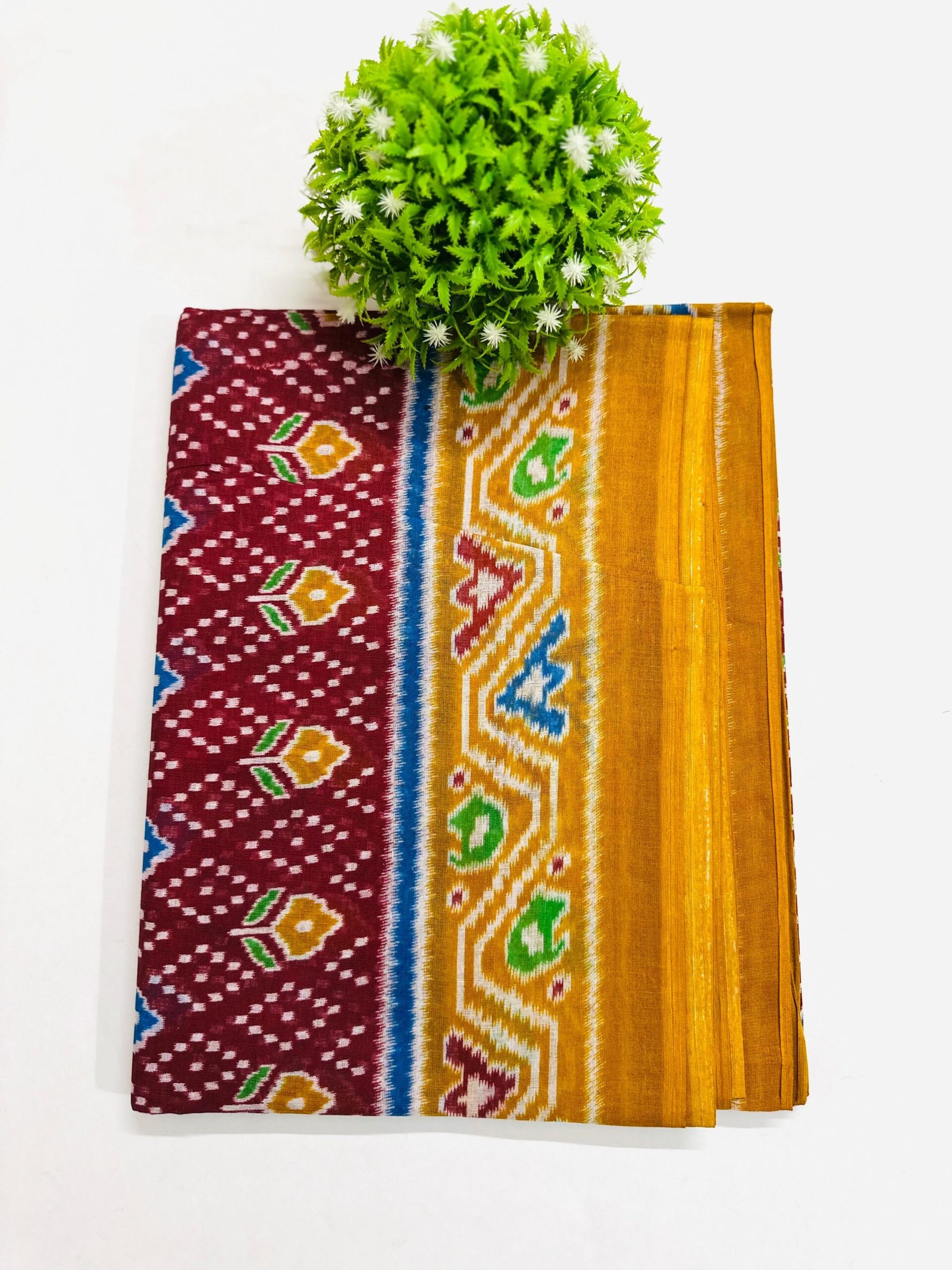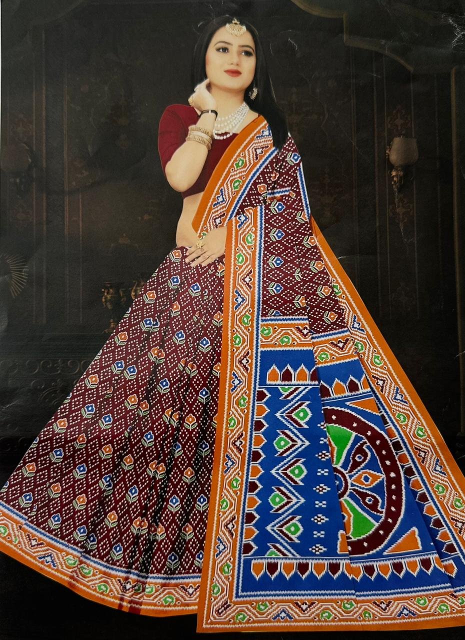 - Color & Pattern:This is a striking panchali cotton saree featuring a rich maroon body with all-over geometric diamond patterns. The most distinctive elements are the wide border and pallu, framed in bright orange and patterned with bold royal blue and multi-colored traditional motifs. The overall look is vibrant, elaborate, and perfect for festive occasions.