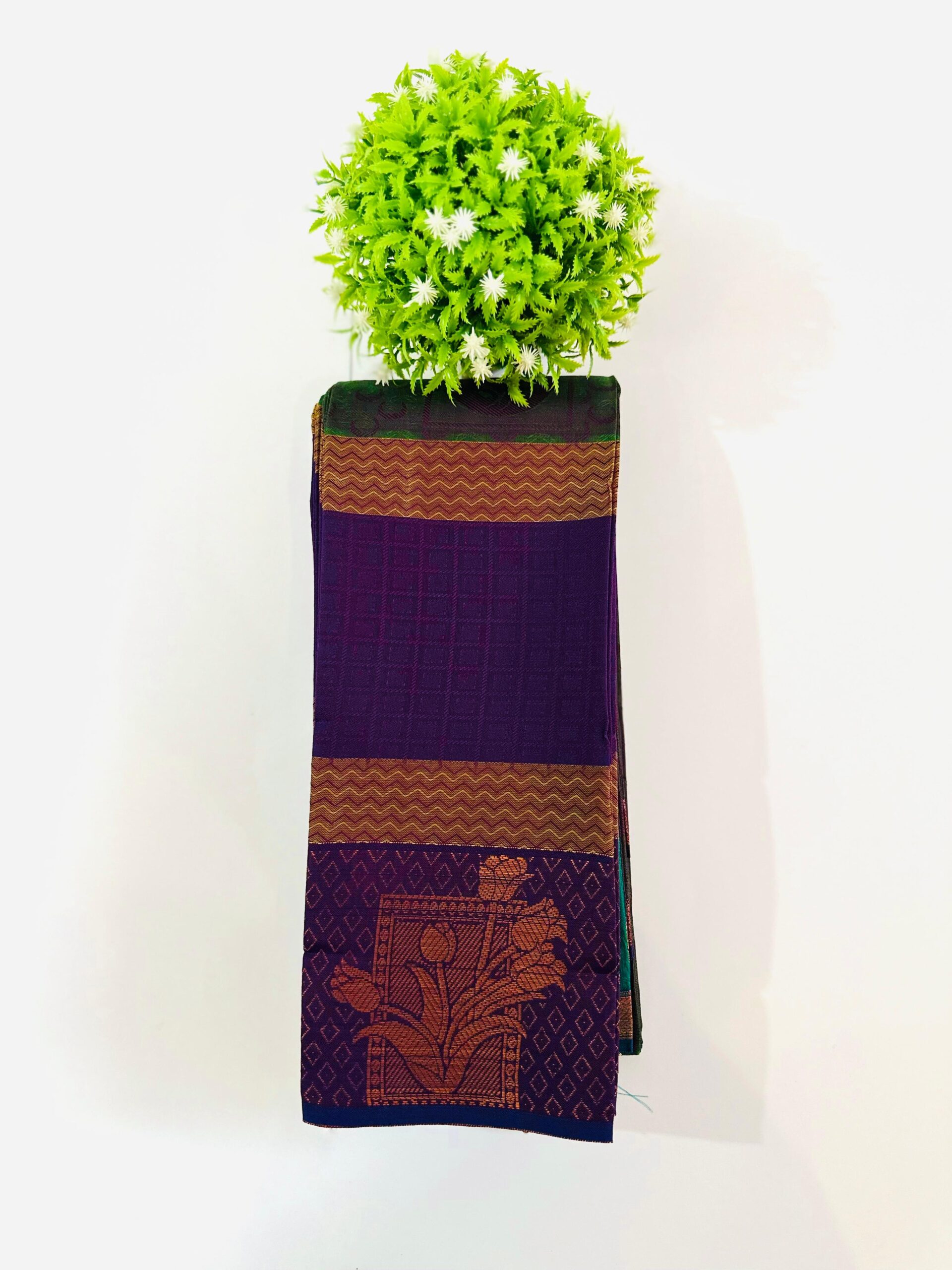 - Color & Pattern:This saree is a striking example of a traditional contrast combination, featuring a Dark Brown/Olive Green body and a vibrant Royal Purple border and pallu, accented with Copper/Golden Zari. The pattern includes subtle overall body motifs and a prominent, ornate Floral/Plant motif woven into the pallu