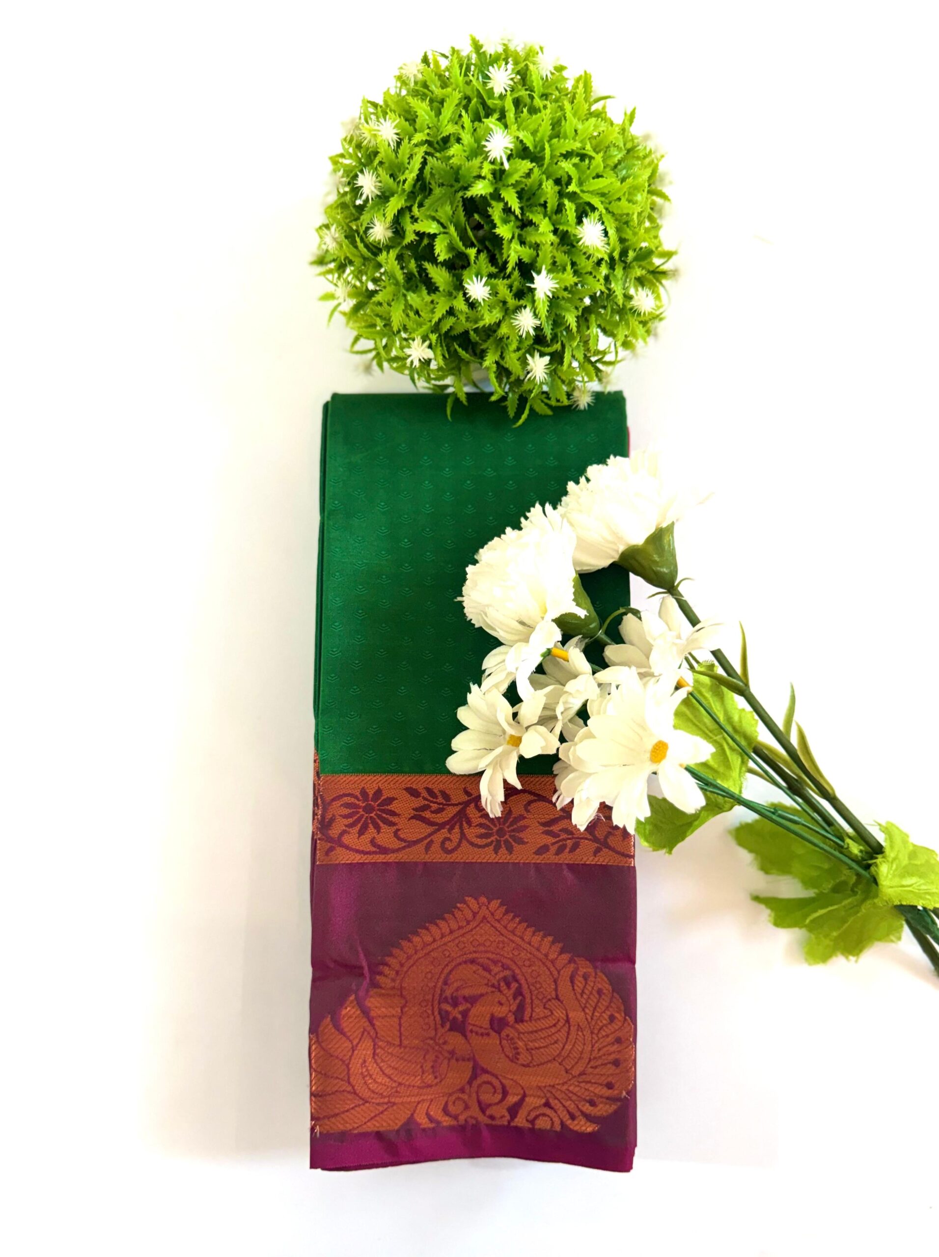 • Color: The body of the saree is a Deep emerald green while border and pallu are in a vibrant magenta . both highlighted with gold zari work.