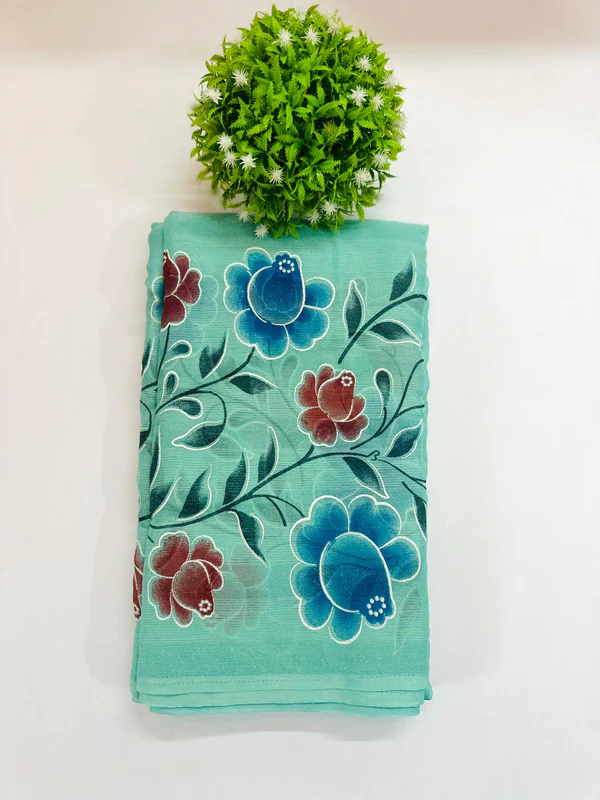 Color & Pattern:The saree is a refreshing mint green/seafoam green base. It features a bold floral pattern with flowers in contrasting vibrant blue and deep maroon-red, connected by deep teal vines and leaves.
