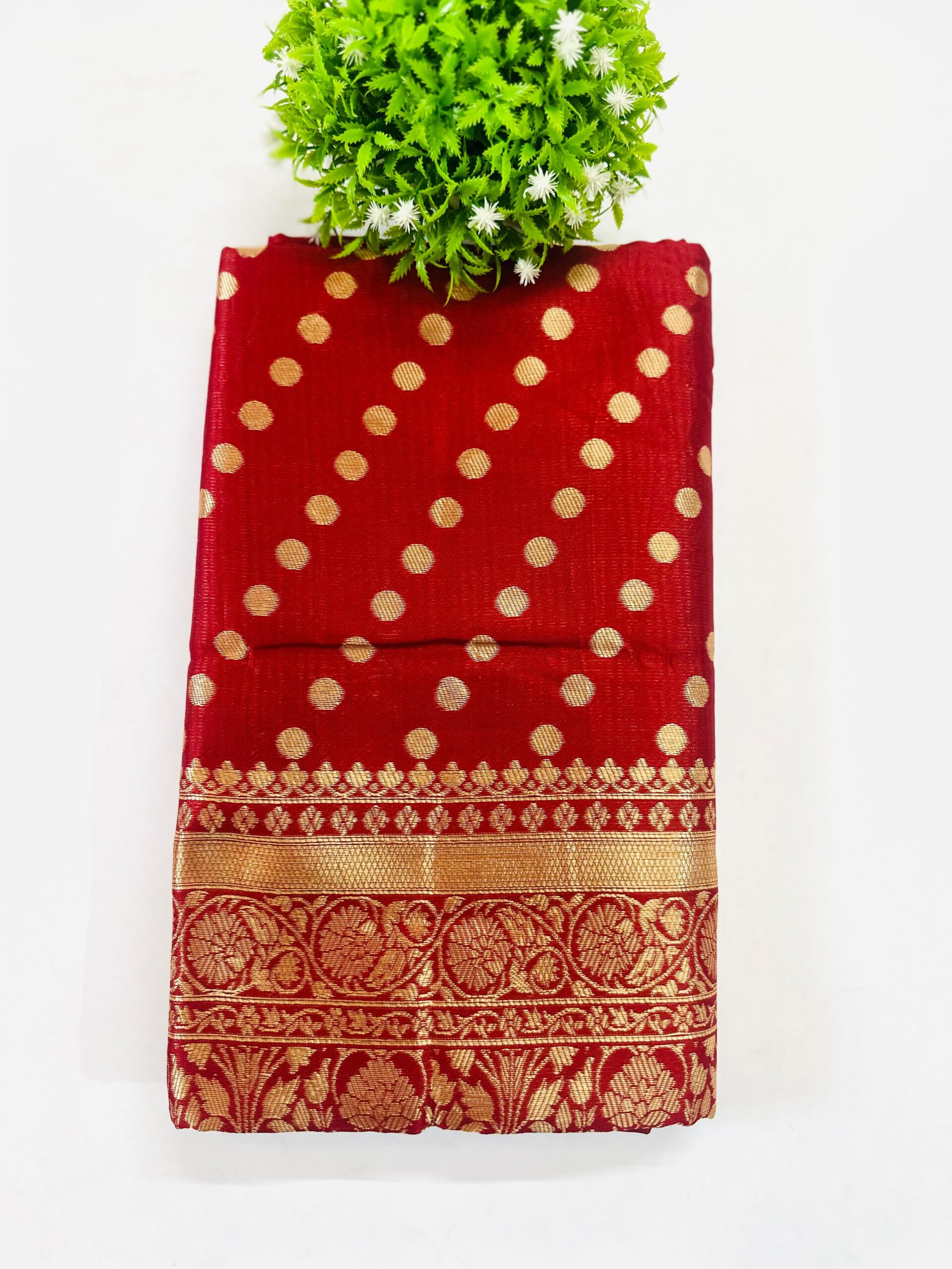 - Color & Pattern:it is a Red Saree with gold Dot/Butti Pattern and an Ornate Gold Zari Border.