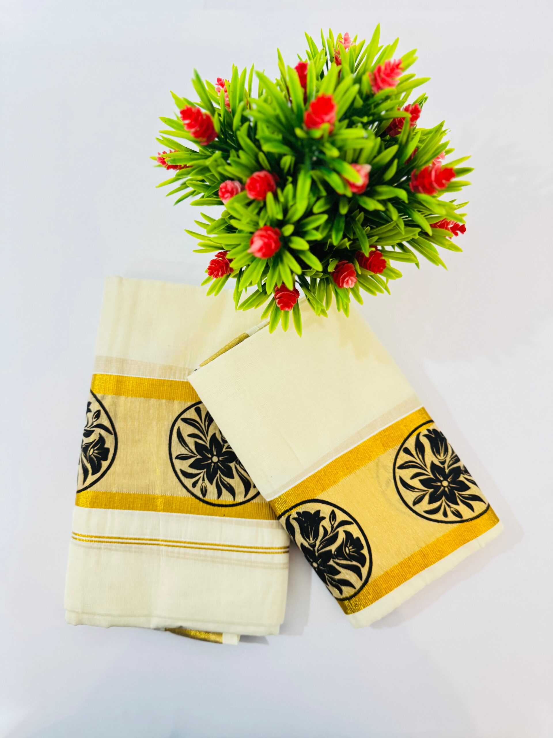 Celebrate tradition with elegance in this exquisite handloom single set mundu, designed for the discerning woman. Crafted from pure cotton, this traditional Kerala attire features a classic off-white body, accentuated by a black patterns and golden/green patterns and golden/violet patterns andGolden kasavu border. The single mundu style is a cherished representation of Kerala’s cultural legacy, and the set completes the look with grace and authenticity.