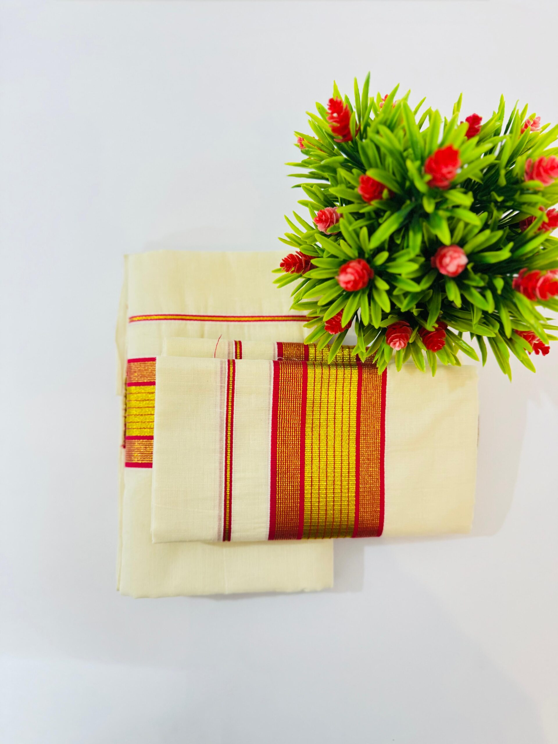 Celebrate tradition with elegance in this exquisite handloom single set mundu, designed for the discerning woman. Crafted from pure cotton, this traditional Kerala attire features a classic off-white body, accentuated by a Red&Golden kasavu border. The single mundu style is a cherished representation of Kerala’s cultural legacy, and the set completes the look with grace and authenticity.