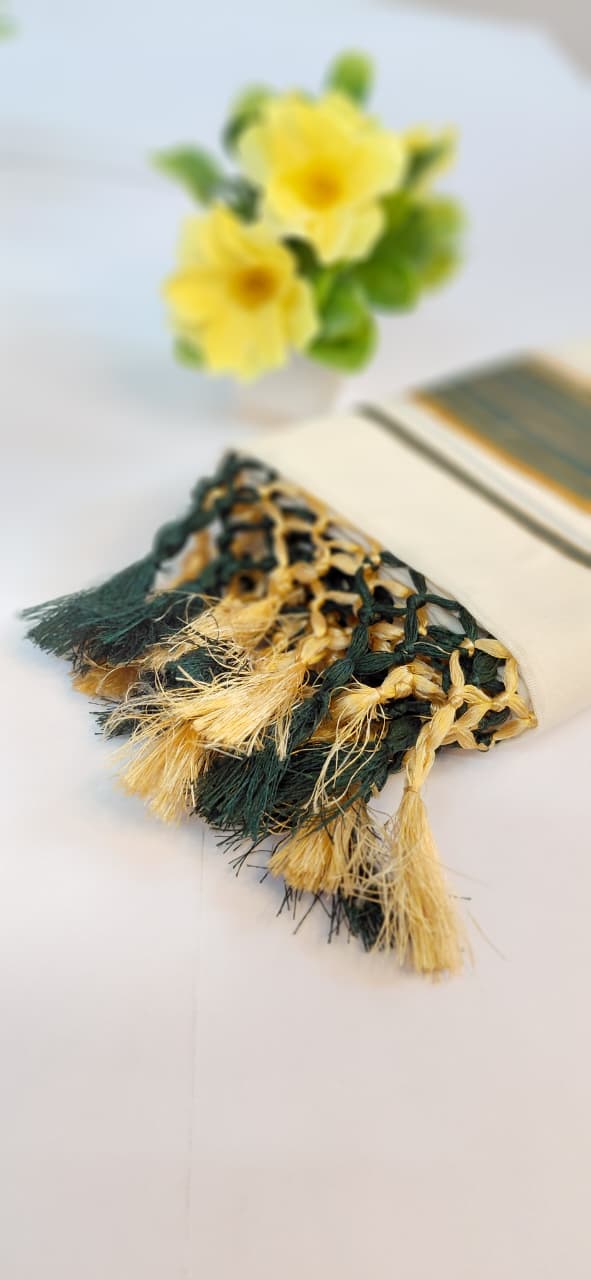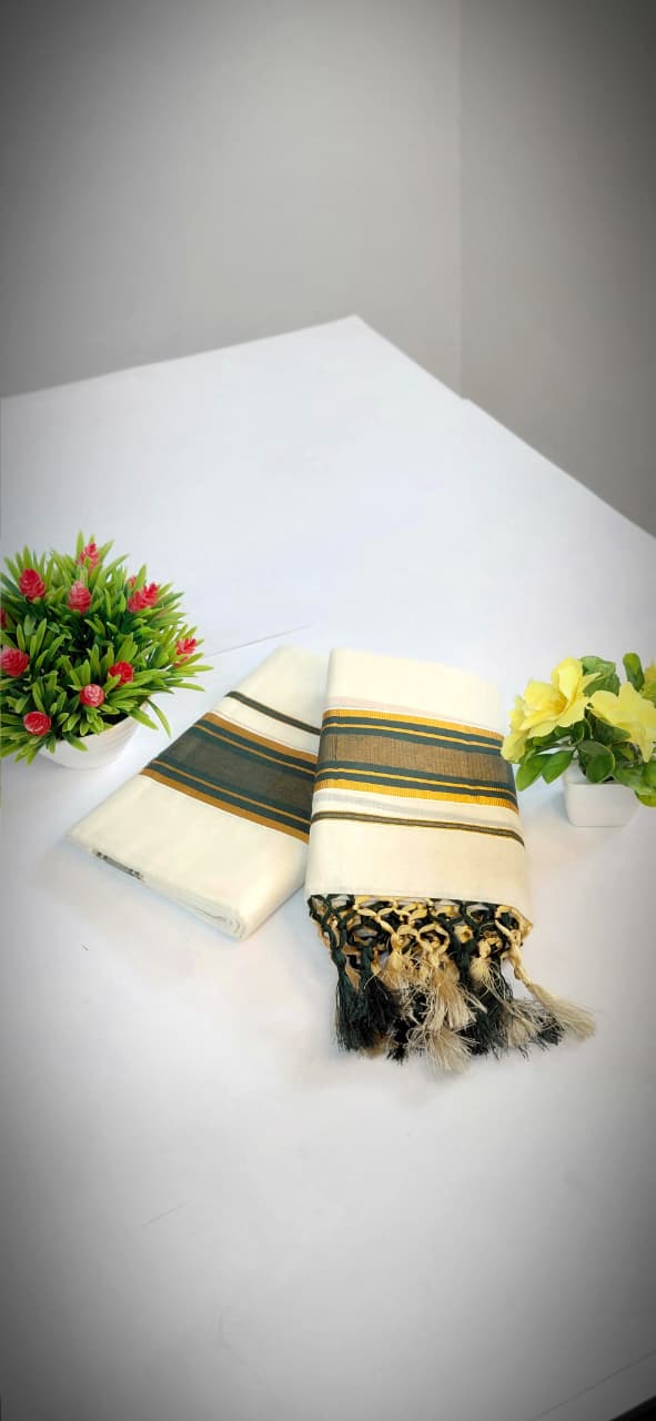 Kerala Cotton Handloom Single Set Mund Gold and Green border
