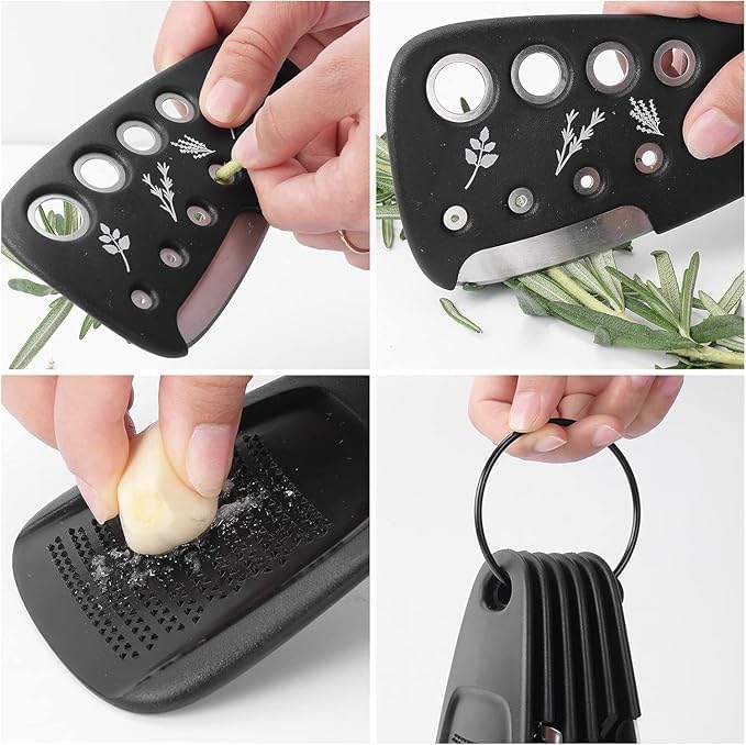 - 6 PC KITCHEN/UNIQUE GADGET SET: Set includes 1 grater for cheeses, vegetables, chocolate; 1 grinder for garlic or ginger; 1 pizza cutter / wheel for pizzas and flatbreads; 1 bottle opener; 1 swivel peeler for vegetables and fruits; 1 herb stipper. This up-to-date kitchen gadget is a great addition to your existing kitchen utensils or can be a refresh!