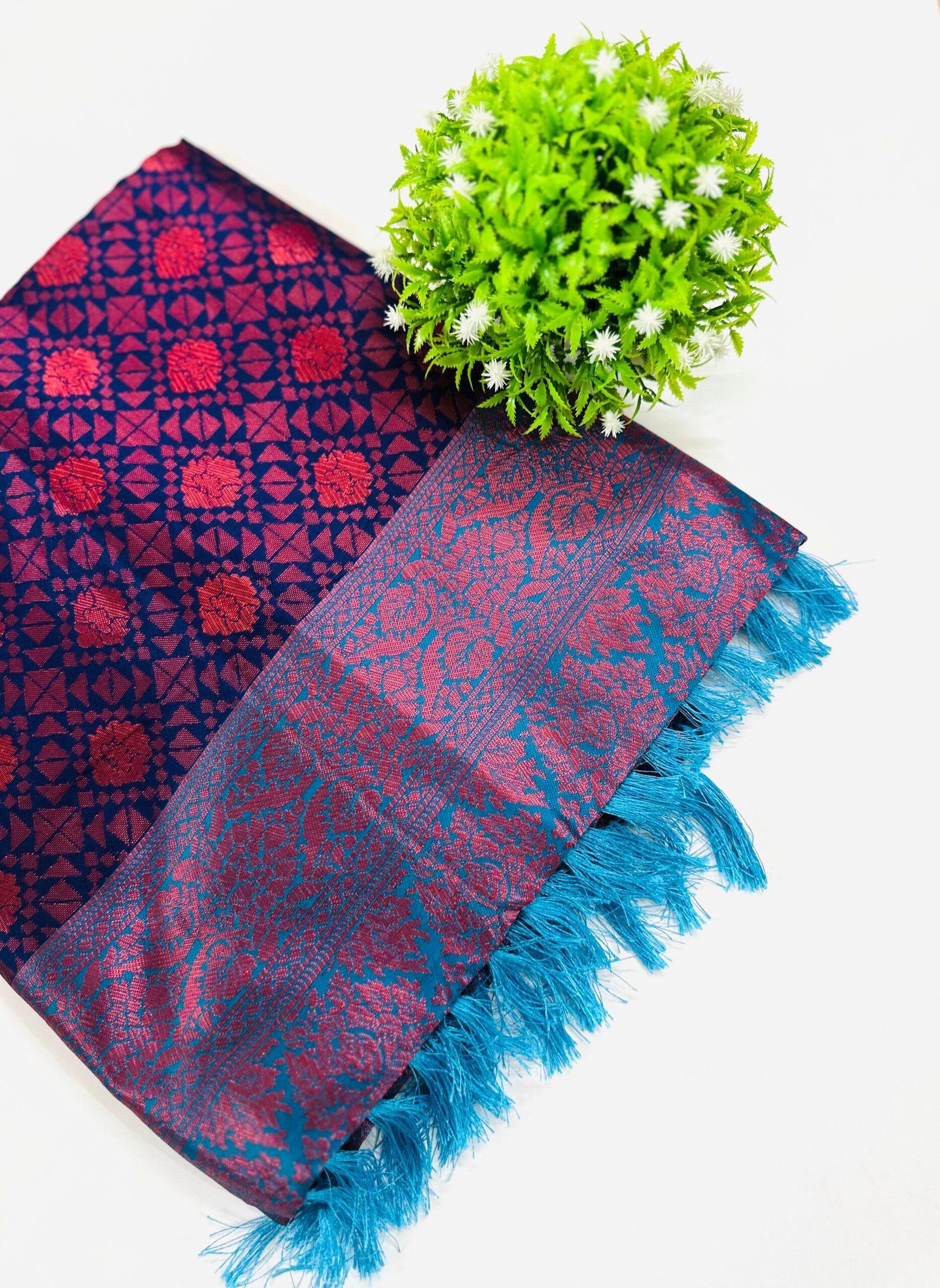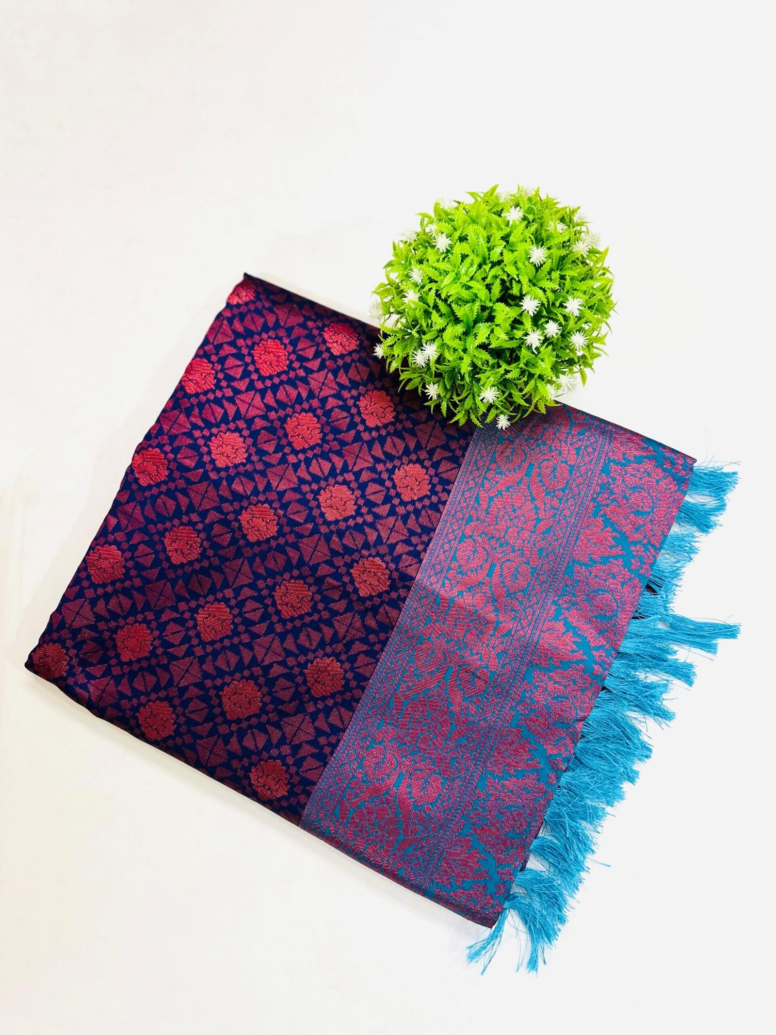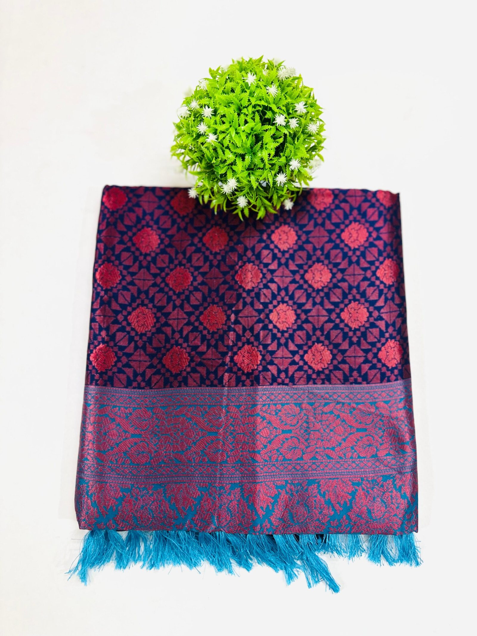 Color & Pattern: A Navy Blue saree with an all-over Red brocade weave, featuring a patterned pallu with Red and Teal accents and bright Teal tassels.