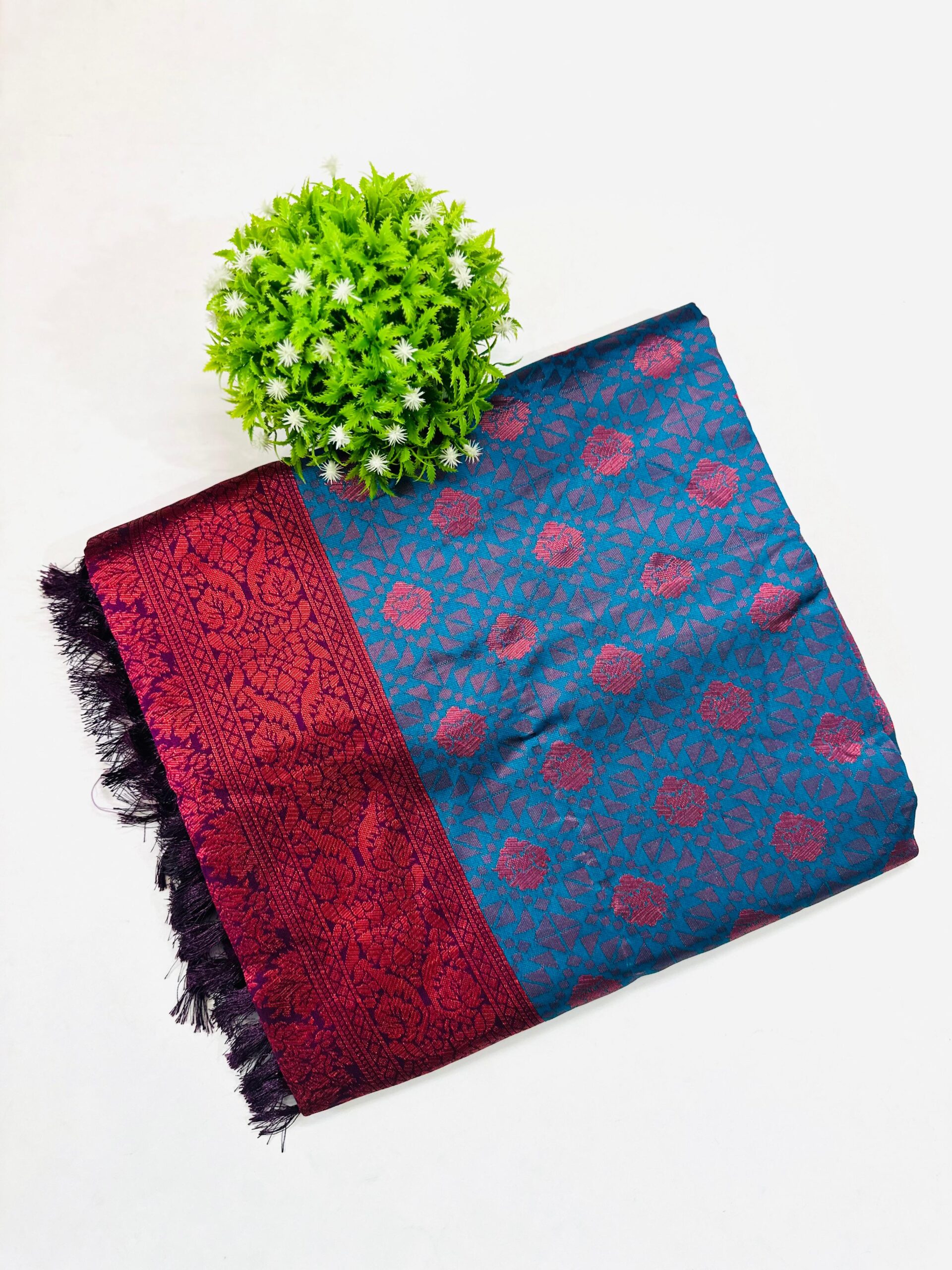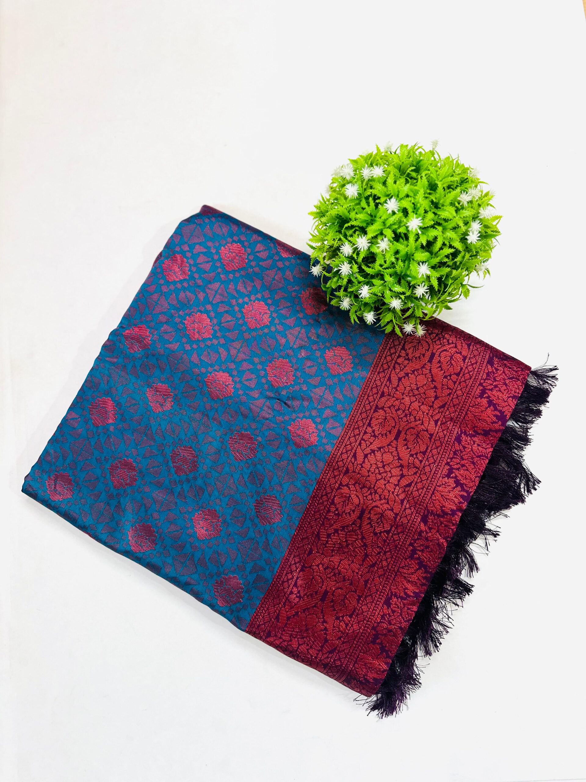 Color & Pattern: A Teal/Peacock Blue saree with an all-over Maroon brocade body, contrasted by a wide, solid Maroon woven pallu.