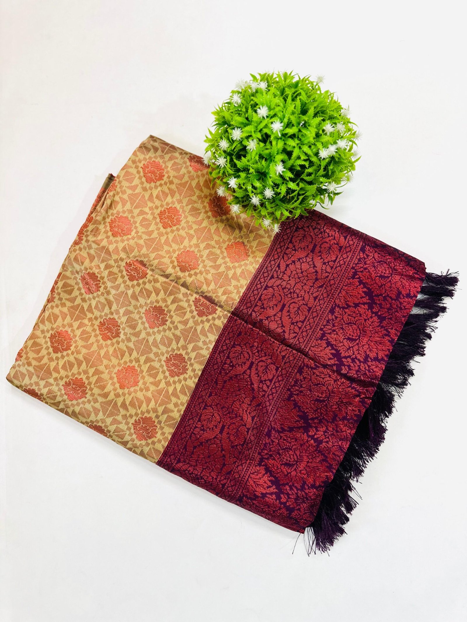 - Color & Pattern: This saree is Beige/Gold saree body with peach/light orange brocade is contrasted by a wide Maroon pallu with a dense traditional floral weave.
