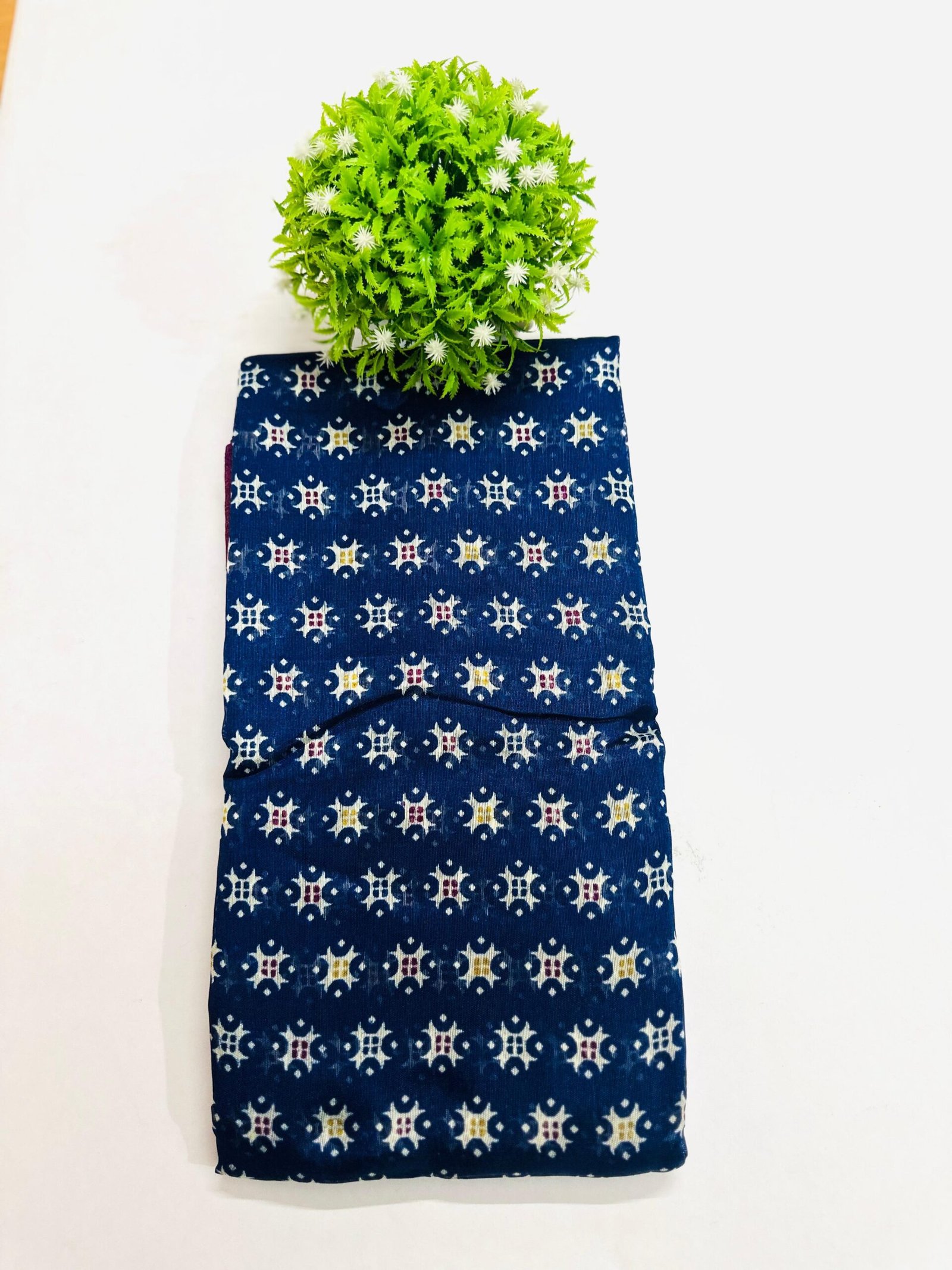 Color & Pattern:.This is a vibrant Deep Navy Blue for the main body and Deep Wine Red for the border. . featuring a traditional geometric ikat-style print across the body and a contrasting patterned border and pallu.