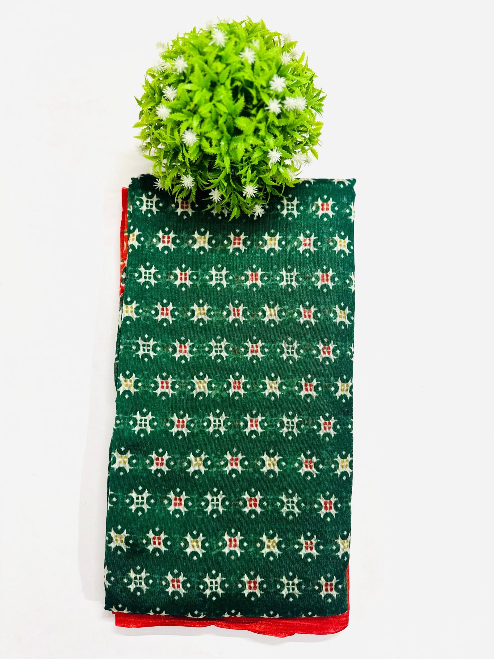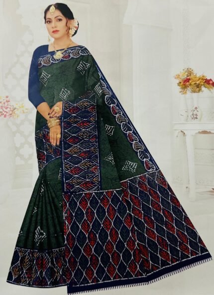 Color & Pattern:.This is a vibrant Deep green for the main body and Red for the border. . featuring a traditional geometric ikat-style print across the body and a contrasting patterned border and pallu.