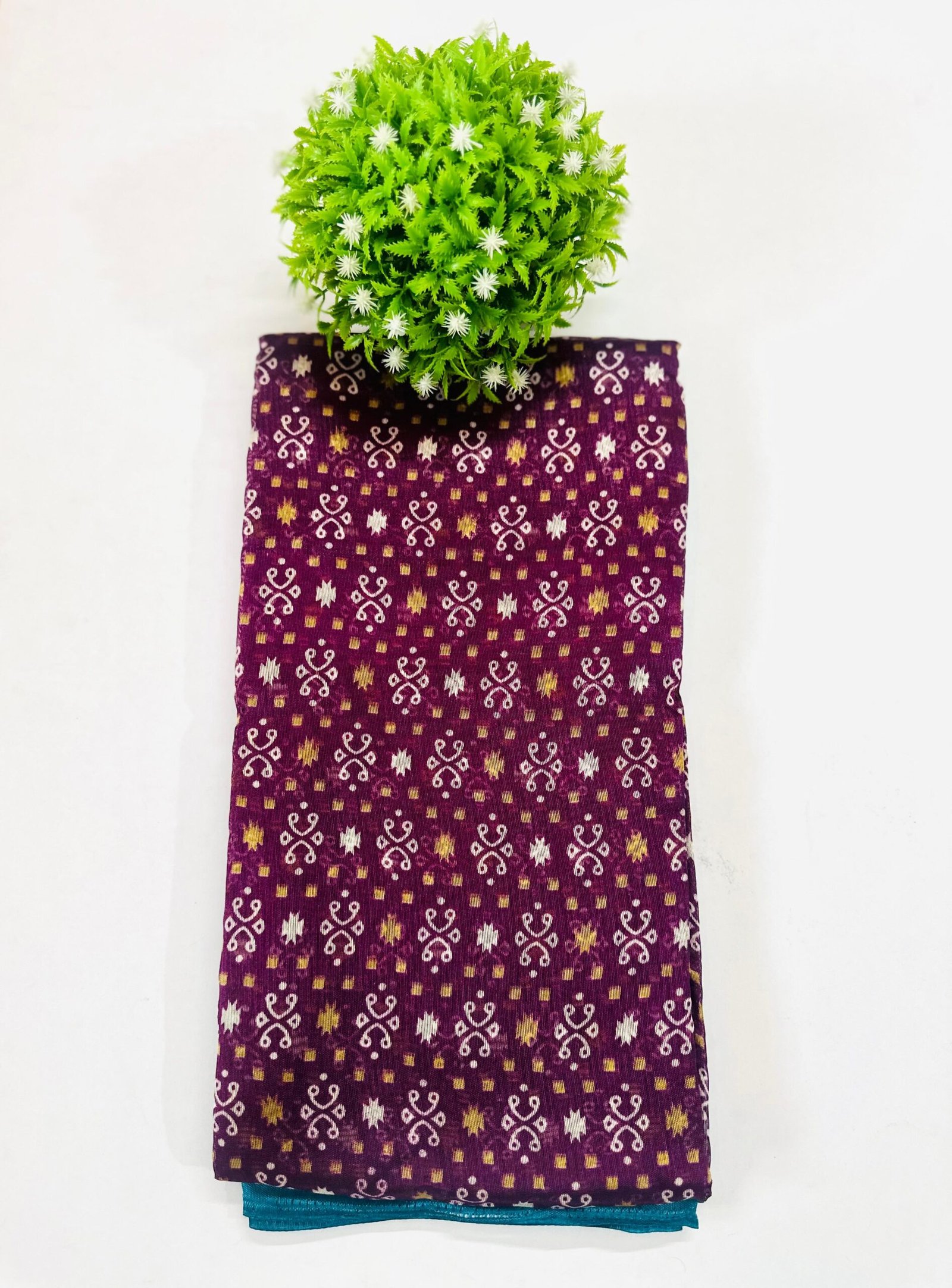 Color & Pattern:.This is a vibrant Deep Purple for the main body and green for the border. . featuring a traditional geometric ikat-style print across the body and a contrasting patterned border and pallu.