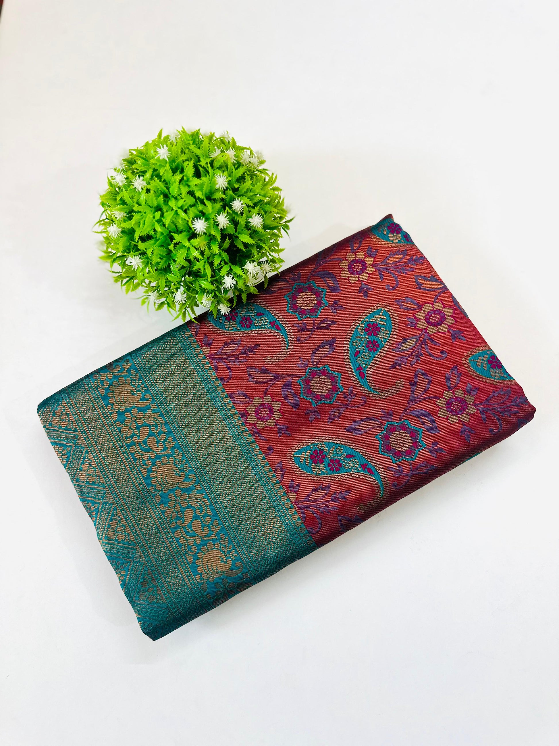 Color & Pattern:The saree is dominated by a deep Maroon/Brick Red body and a contrasting wide border in a rich Teal/Peacock Blue. The large paisley motifs on the body are woven in multiple colors, including shades of teal, dark blue, and gold. This dark color is used for the striking border and pallu, which are heavily patterned with dense traditional ornamental designs.