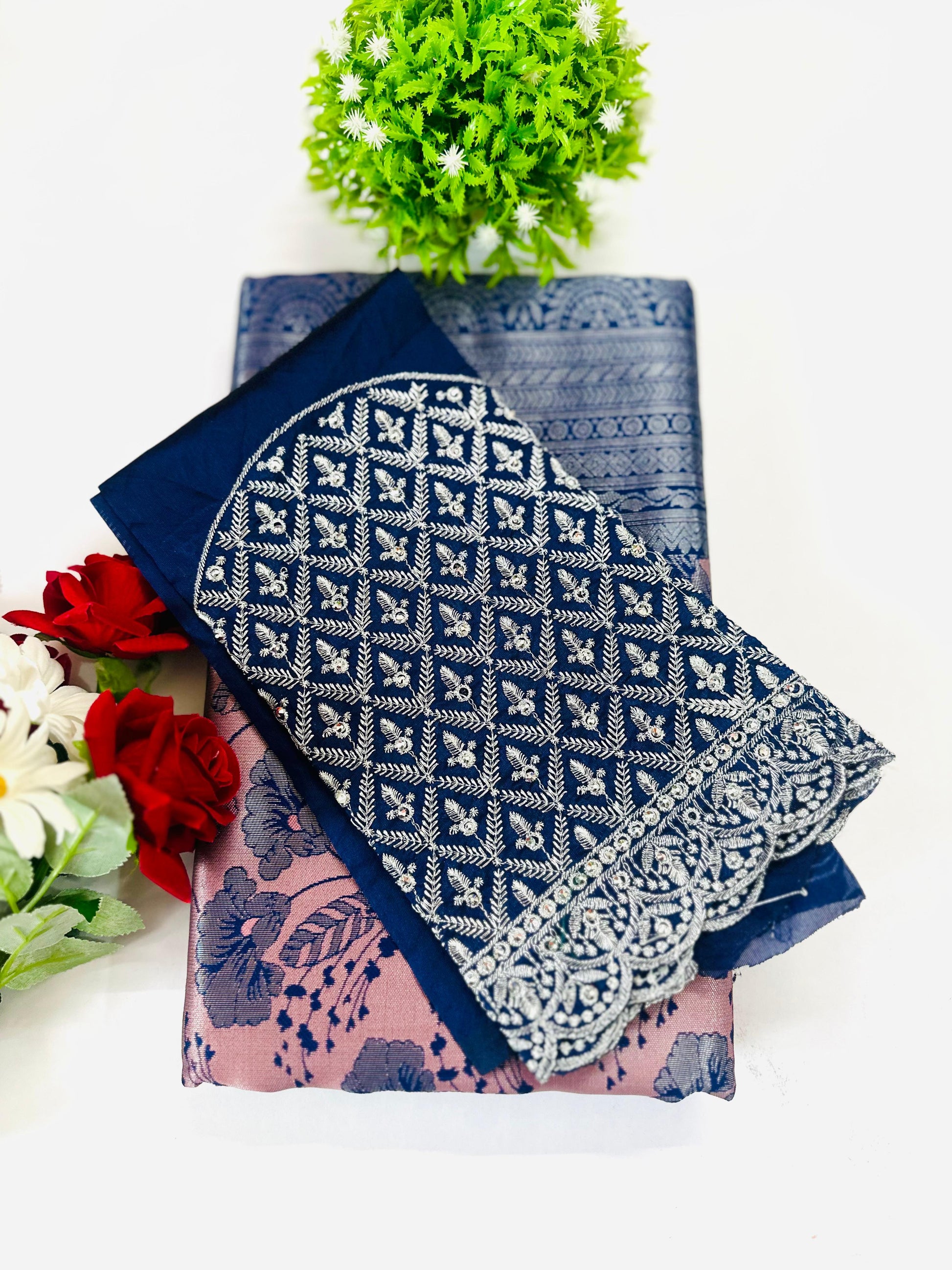 Color & Pattern:This saree is defined by its dramatic color contrast and rich brocade weave. The body is a soft dusty mauve/pink with large, woven floral and leaf motifs in deep navy blue. This dark color is used for the striking border and pallu, which are heavily patterned with dense traditional ornamental designs.