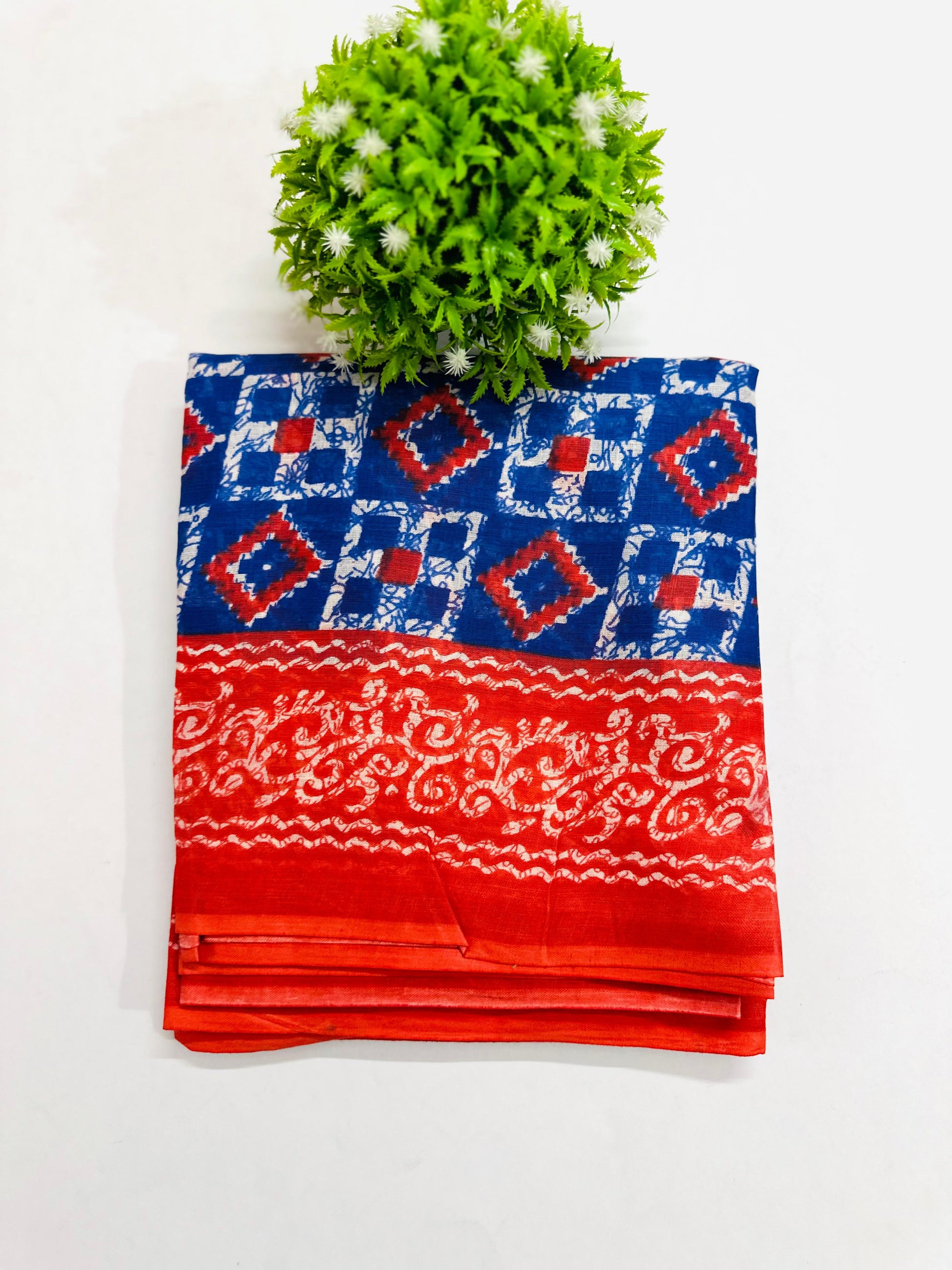 Color & Pattern:This saree is primarily deep blue with a dense, fine red, white, and blue geometric pattern. The most notable contrast is the wide red border and lower pallu, which features large blue paisley motifs.