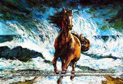 This picture shows a powerful horse running freely along the shore with waves crashing behind it. The artwork captures strength, freedom, and energy against a dramatic ocean backdrop.