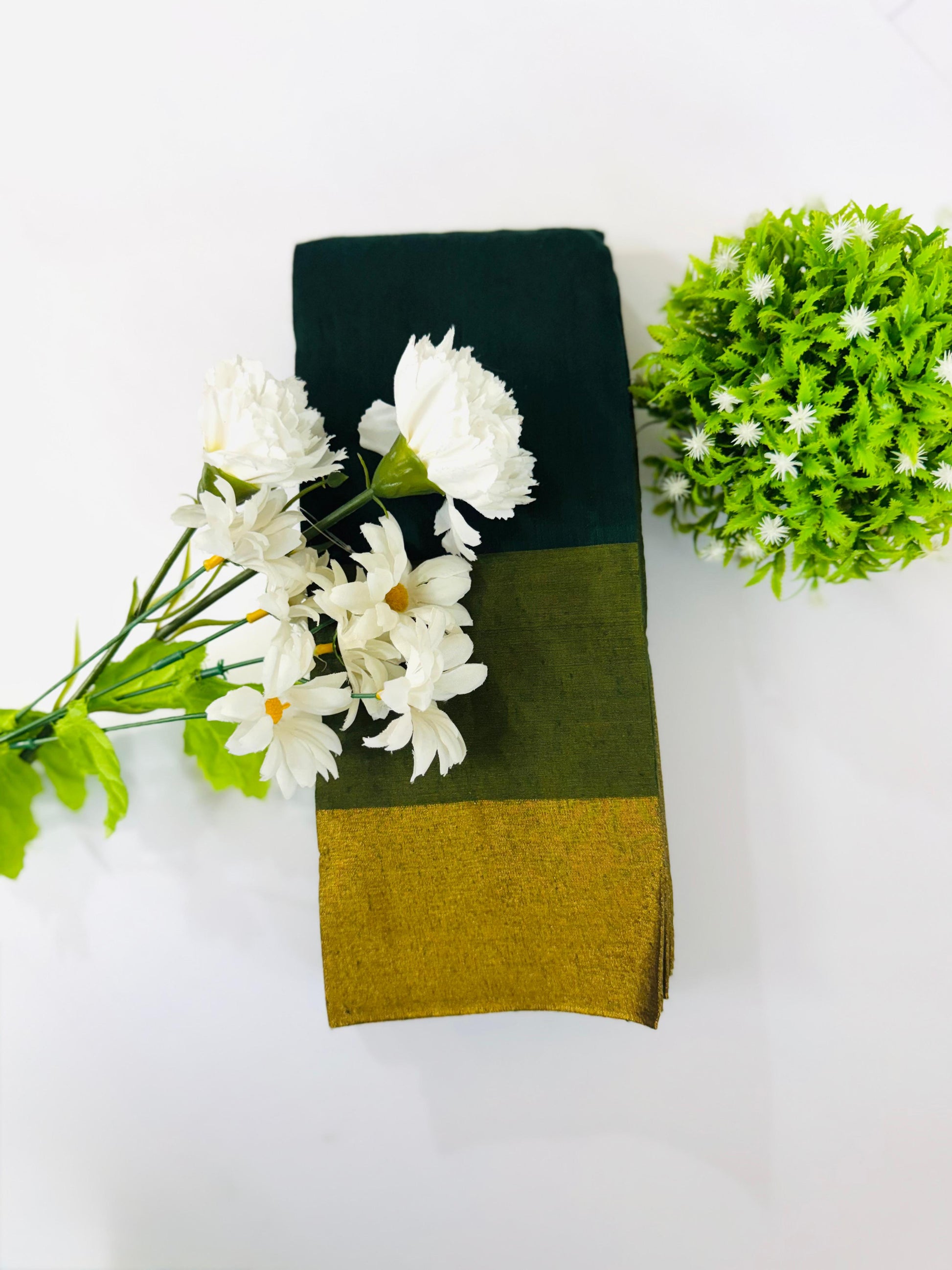 Border: A broad band of gold on both edges of the saree. The gold border is clean and simple, relying on the sheen of the metallic thread rather than intricate patterns.