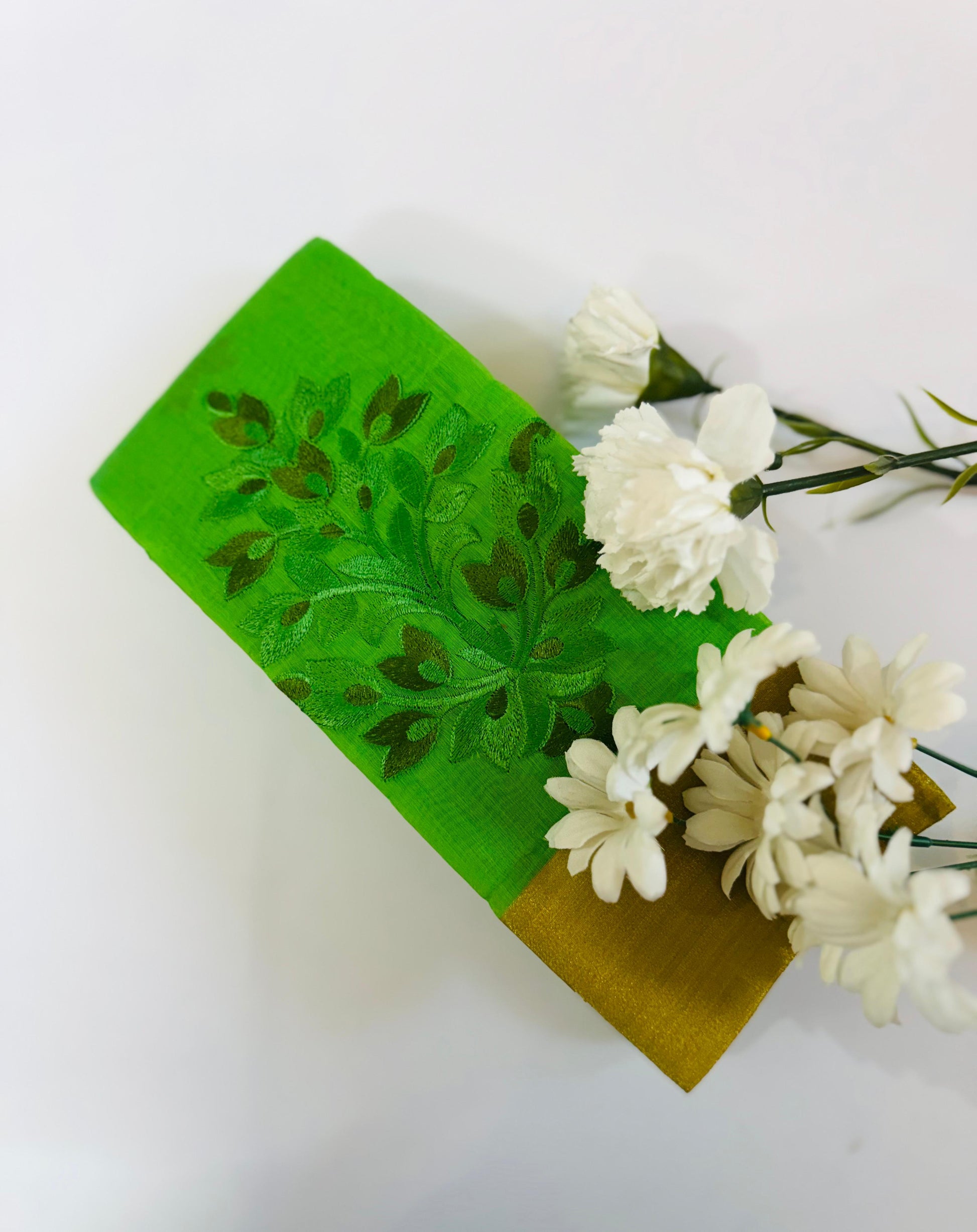 Color: Parrot green in body golden zari in border.the body of the saree is adorned with beautiful thread embroidery motifs in shades of green and olive.