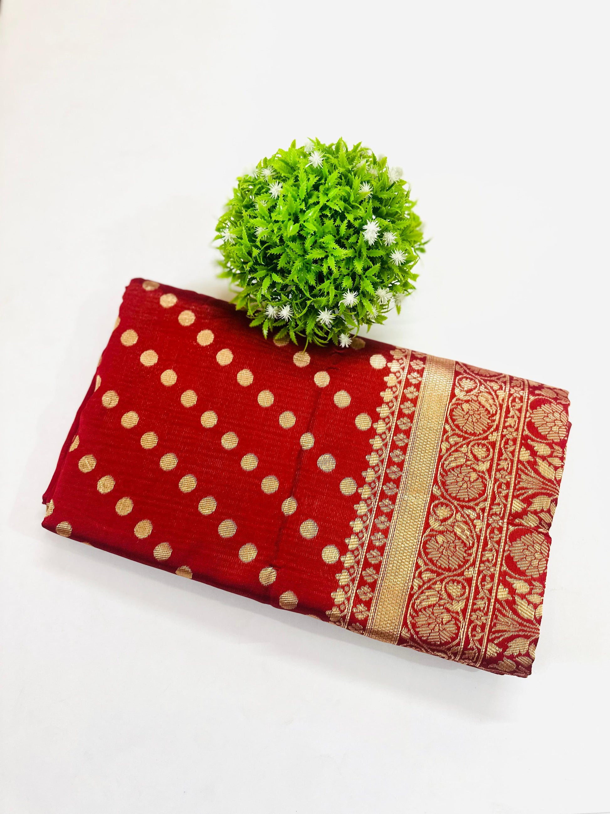 Color & Pattern:it is a Red Saree with gold Dot/Butti Pattern and an Ornate Gold Zari Border.
