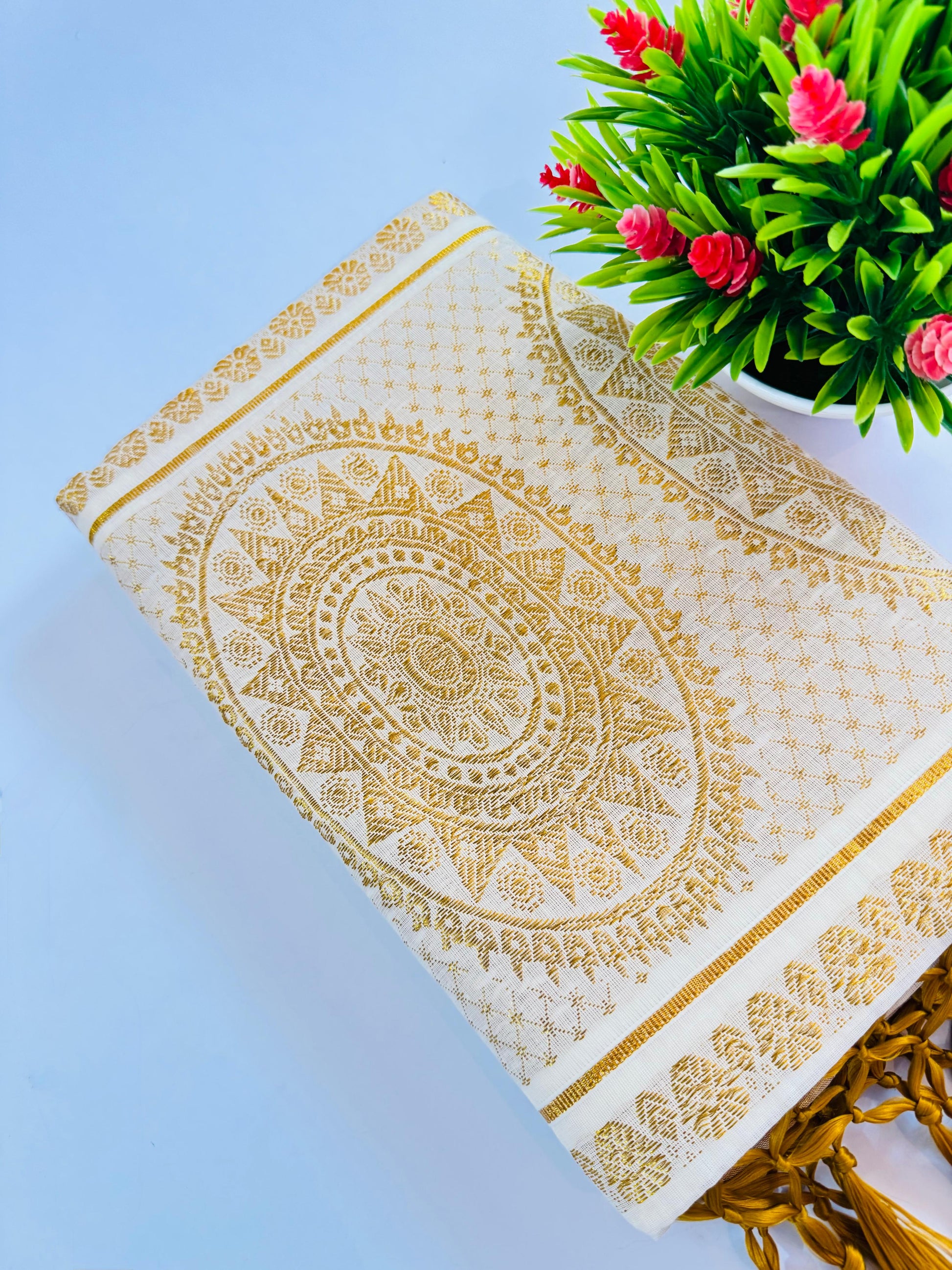 Celebrate tradition with elegance in this exquisite handloom cotton saree , designed for the discerning woman. Crafted from pure cotton, this traditional Kerala attire features a classic off-white body, accentuated by a Gold stripes on body with Gold thread work border. The Saree style is a cherished representation of Kerala's cultural legacy, and the set completes the look with grace and authenticity.