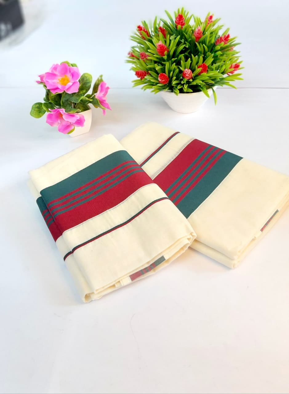 Kerala Cotton Set Mundu (Single) with Green and Red striped Border- 2.80 Mtrs