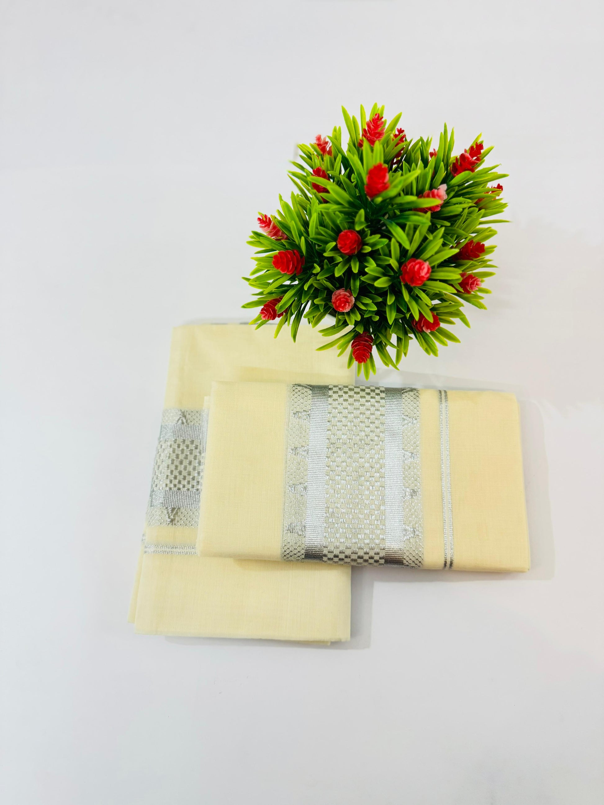 Celebrate tradition with elegance in this exquisite handloom single set mundu, designed for the discerning woman. Crafted from pure cotton, this traditional Kerala attire features a classic off-white body, accentuated by a Golden kasavu/ Silver kasavu border. The single mundu style is a cherished representation of Kerala's cultural legacy, and the set completes the look with grace and authenticity.