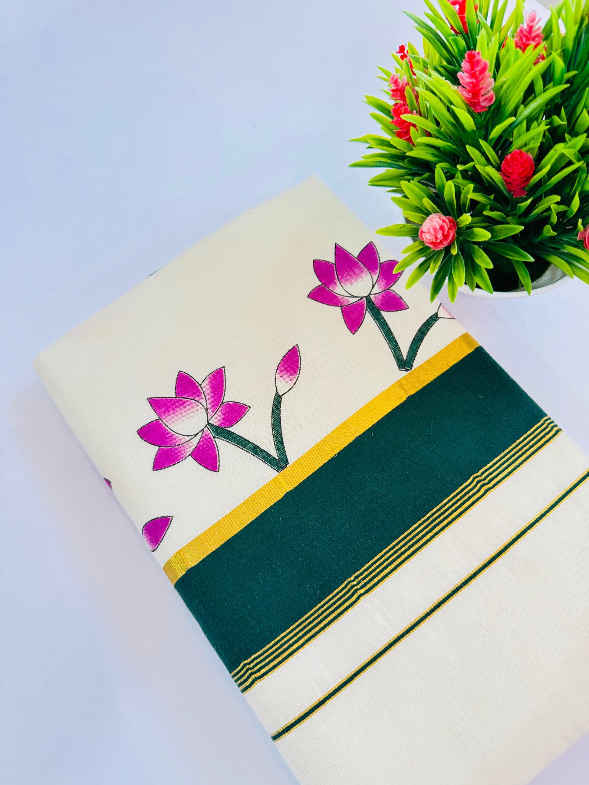 Celebrate tradition with elegance in this exquisite handloom Kerala Cotton Handloom Saree, designed for the discerning woman. Crafted from pure cotton, this traditional Kerala attire features a classic off-white body, accentuated by a Plain body with Lotus Print and gold and green border. The Cotton Handloom Saree style is a cherished representation of Kerala's cultural legacy, and the set completes the look with grace and authenticity.