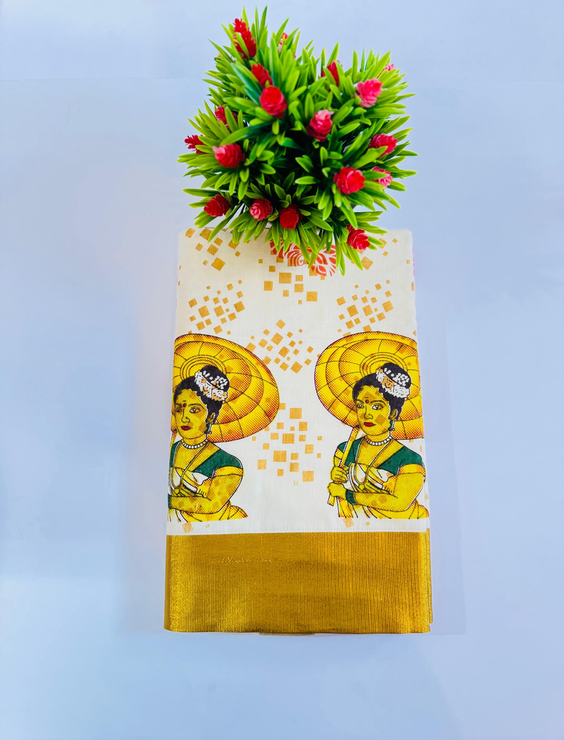 Kerala Handloom Cotton Saree With Traditional Print Design And Golden Border.