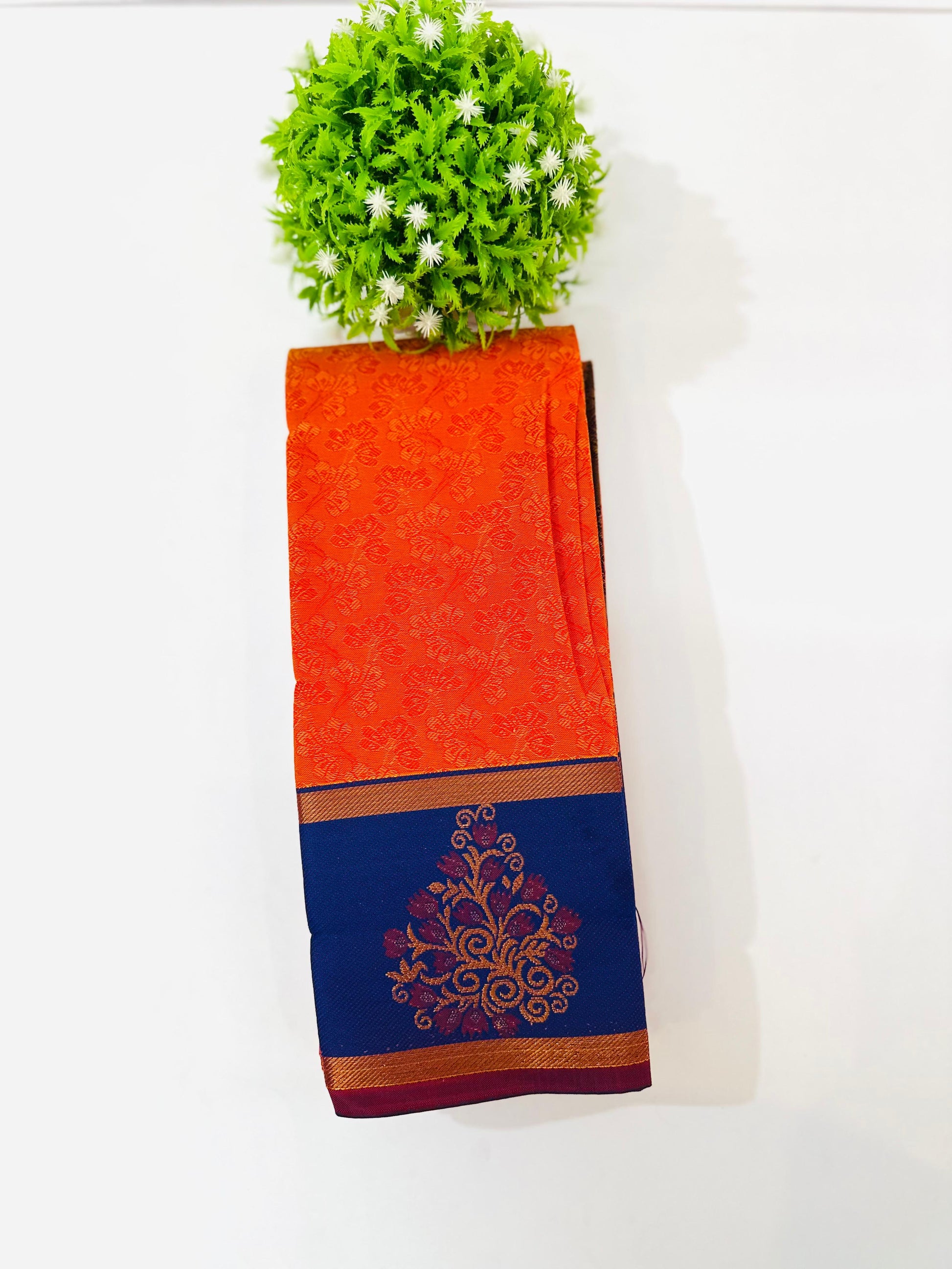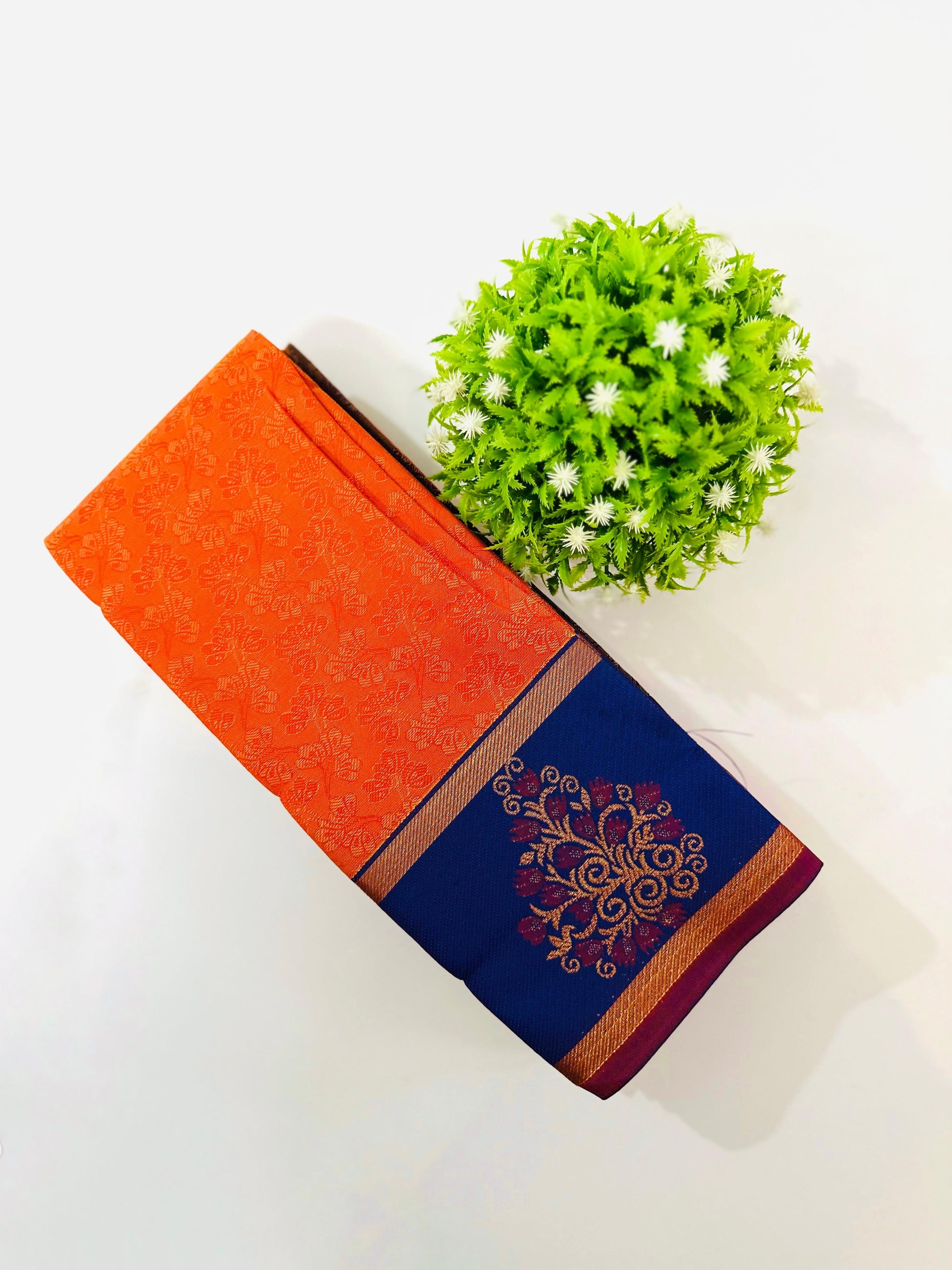 colour&pattern:Vivid Orange body with a stark contrast Navy Blue border and pallu. All patterns are woven using shimmering Gold Zari (metallic thread).