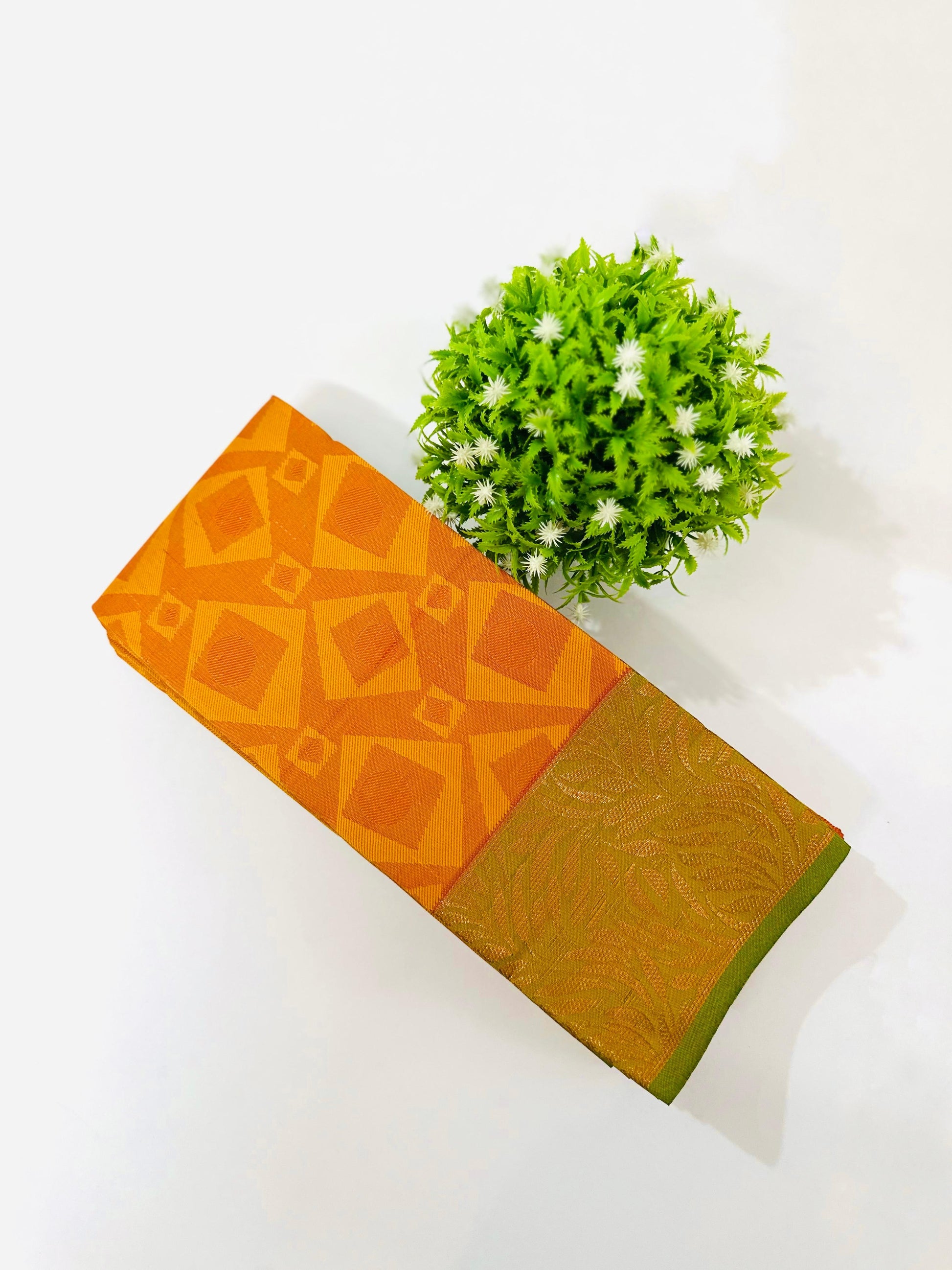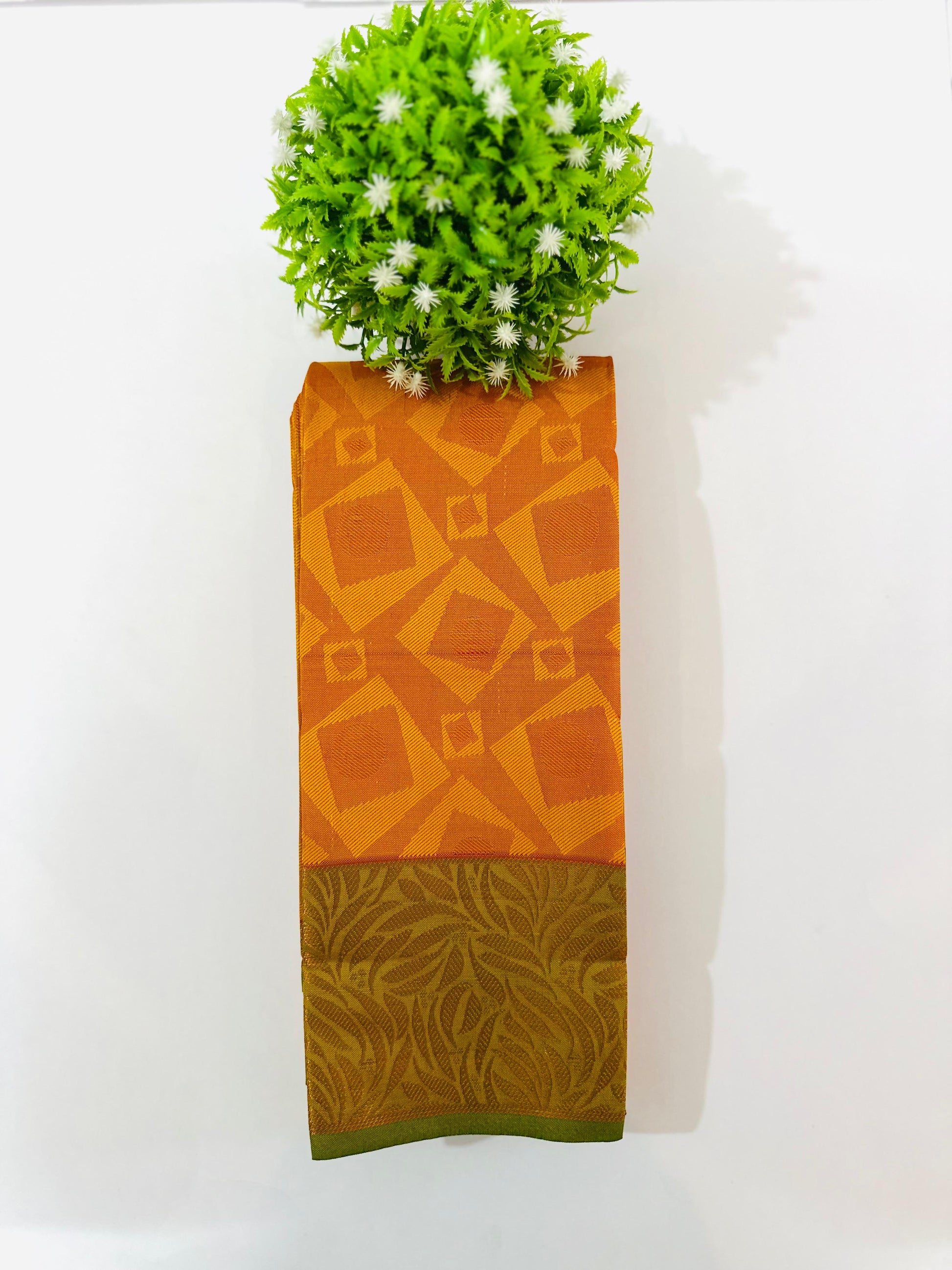 colour&pattern:A Mustard/Deep Orange body featuring a large-scale, all-over geometric or diamond woven pattern. It is contrasted by a wide Olive Green border and pallu with a distinct leaf/wave motif.
