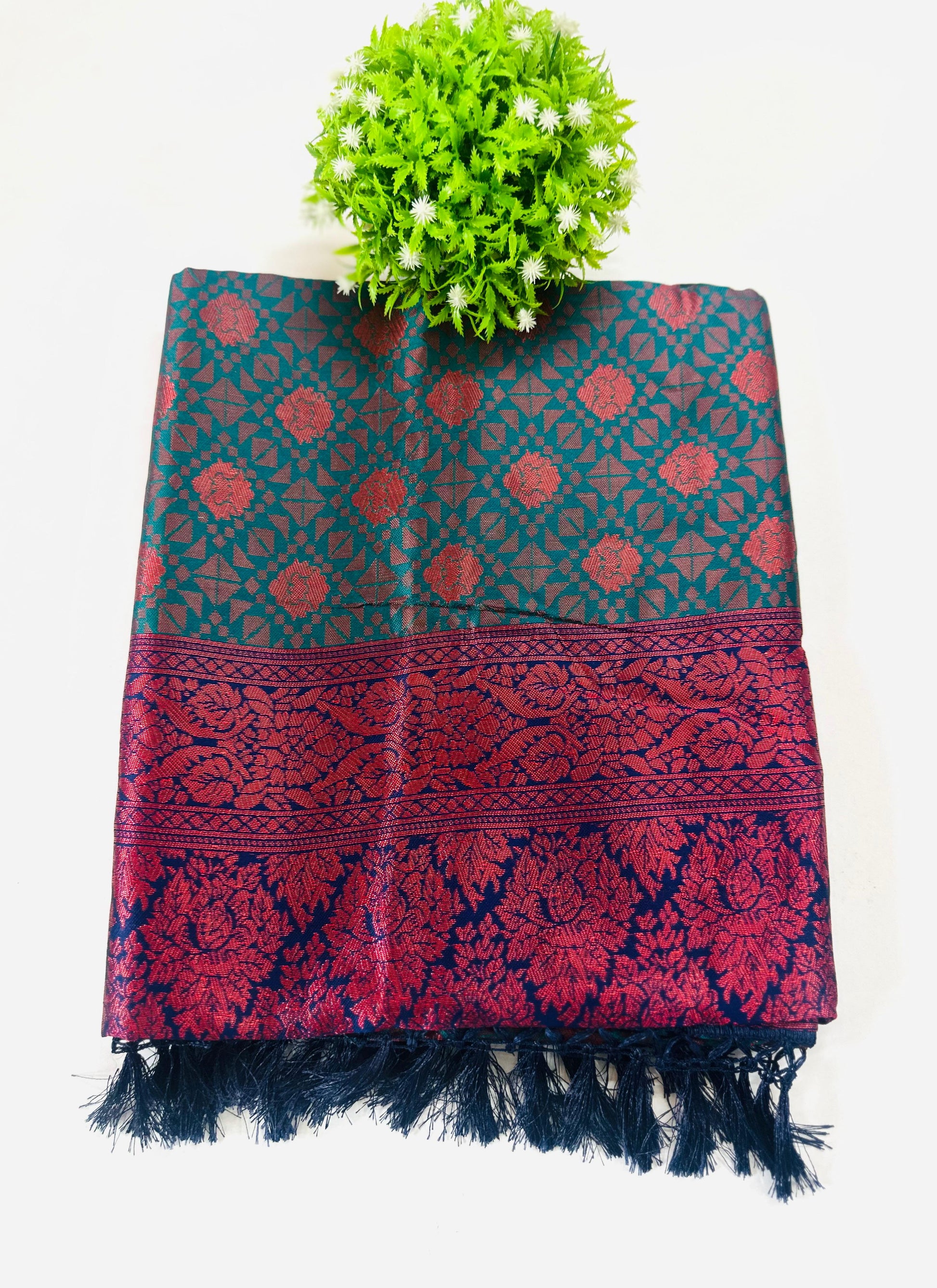 Color & Pattern: This saree is Teal/Dark Turquoise with an all-over Red/Deep Pink brocade pattern and features a contrasting Navy Blue pallu woven with dense Red/Maroon floral designs.