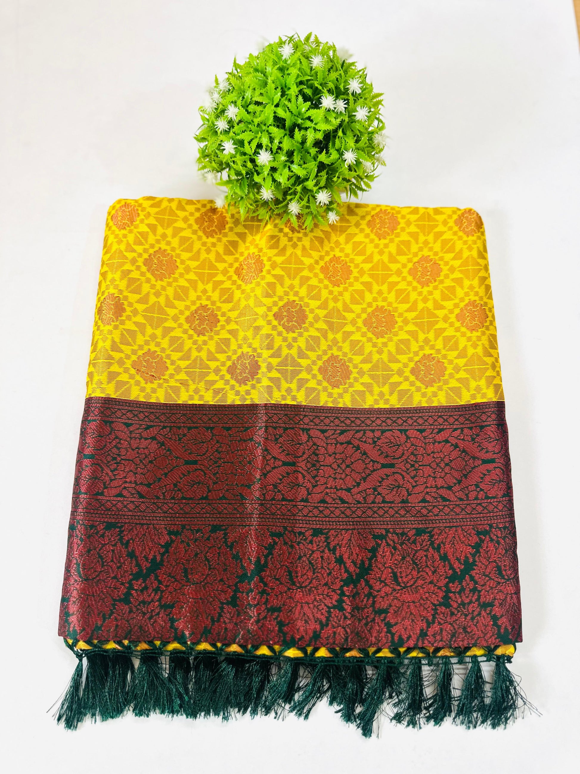 Color & Pattern: This saree is Yellow with an all-over Red/Deep Pink brocade pattern and features a contrasting Maroon and Dark Green floral woven pallu.