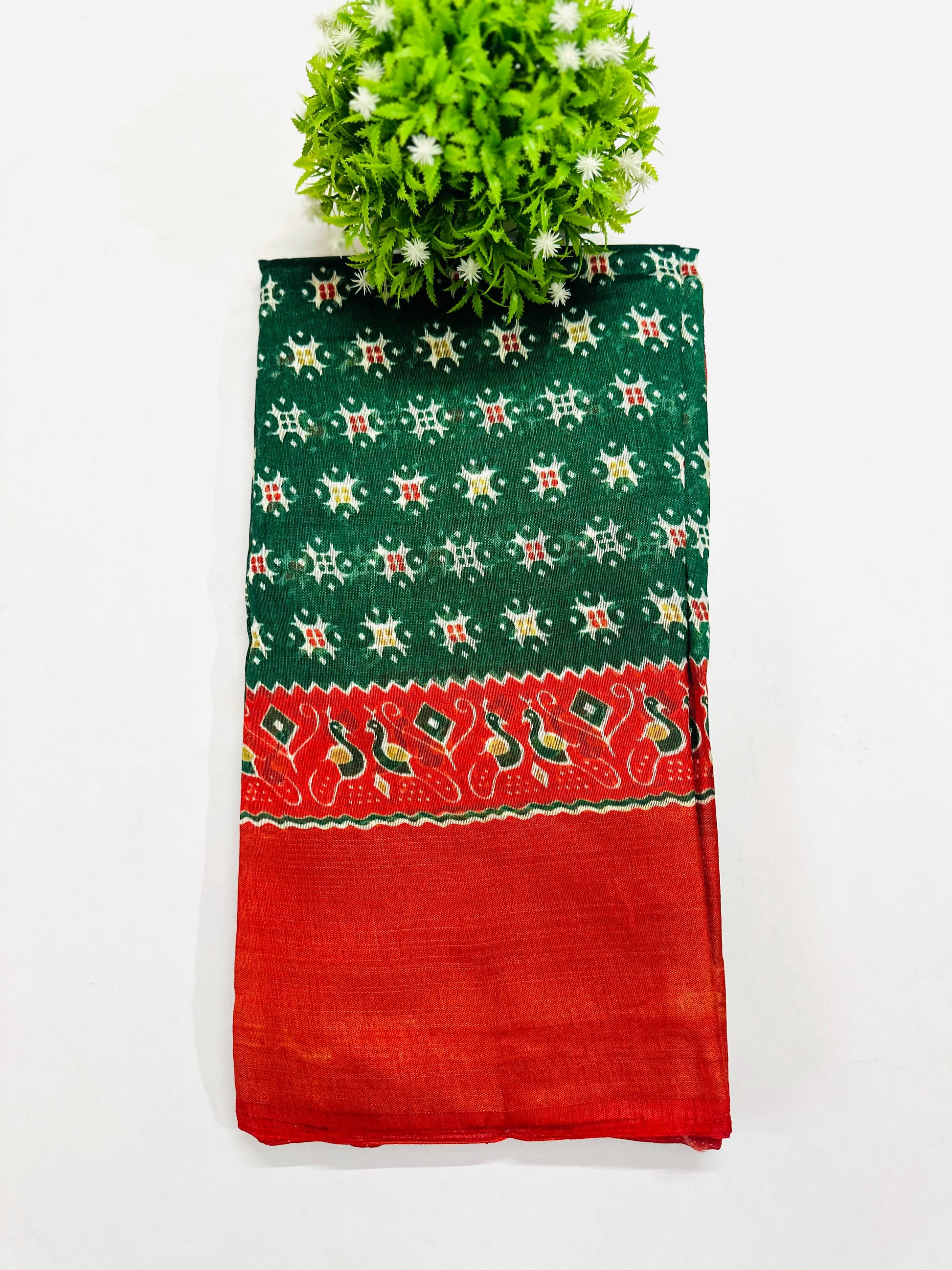Color & Pattern:.This is a vibrant Deep green for the main body and Red for the border. . featuring a traditional geometric ikat-style print across the body and a contrasting patterned border and pallu.